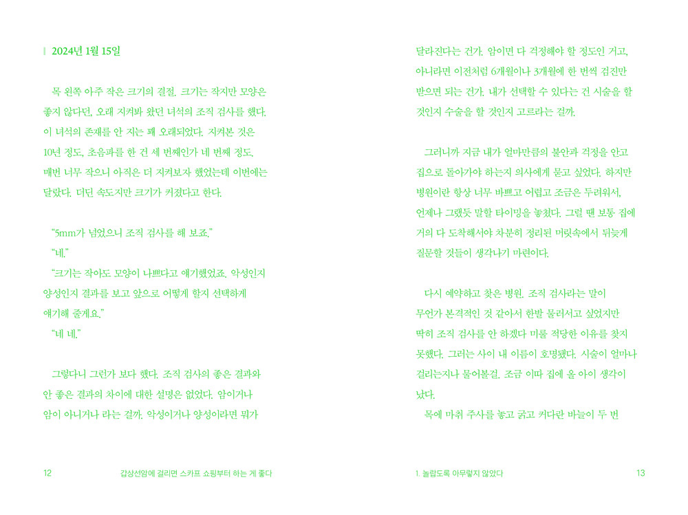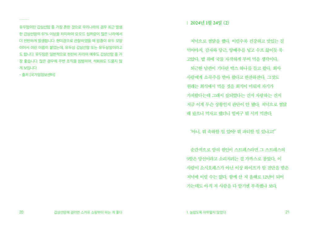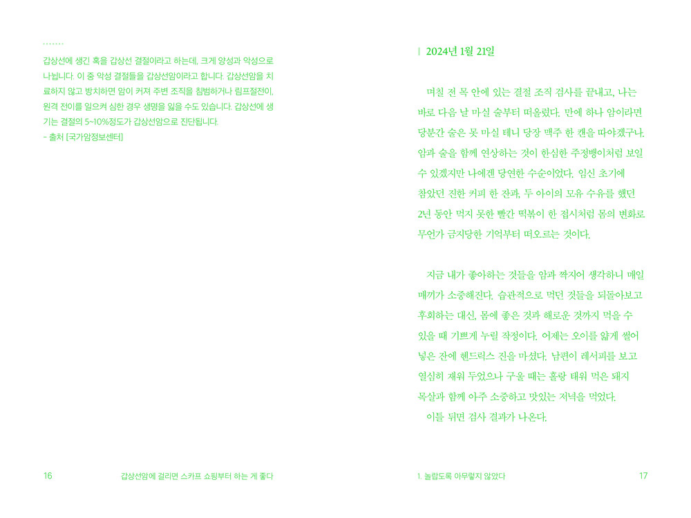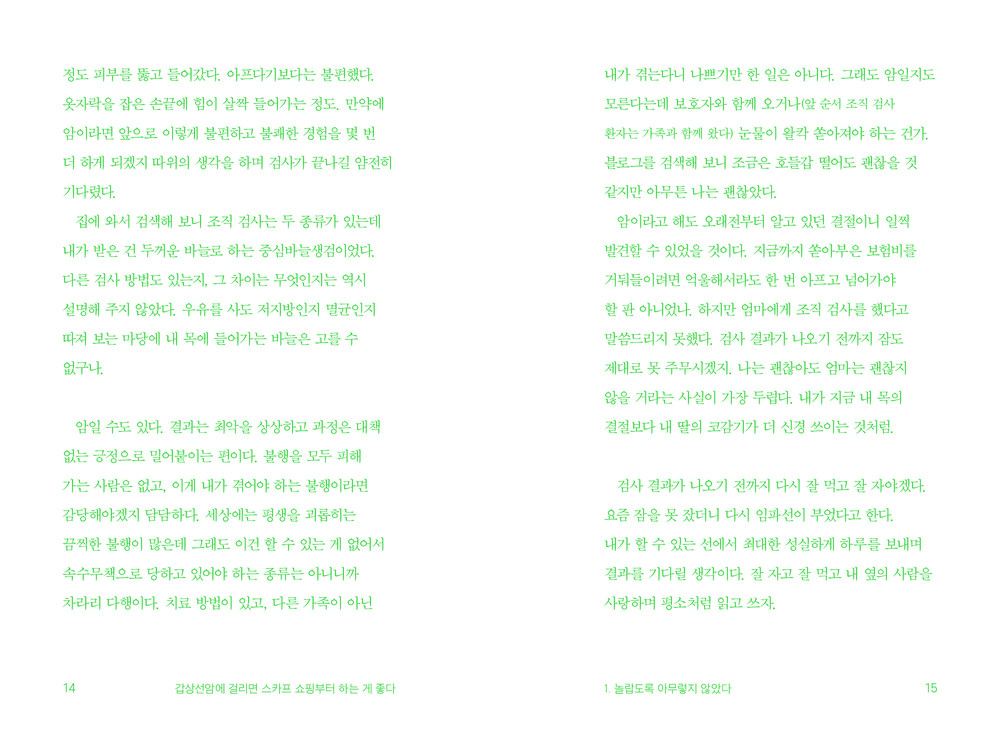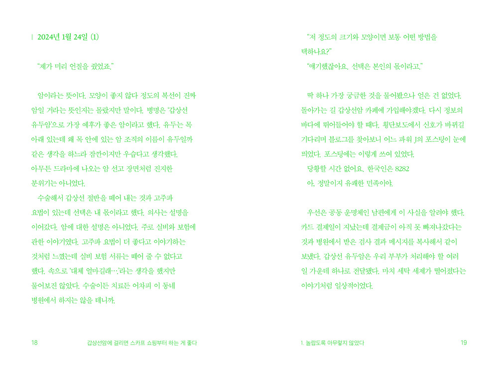 갑상선 유두암은 우리 부부가 처리해야 할 여러 일 가운데 하나로 전달됐다. 마치 세탁 세제가 떨어졌다는 이야기처럼 일상적이었다. p.19