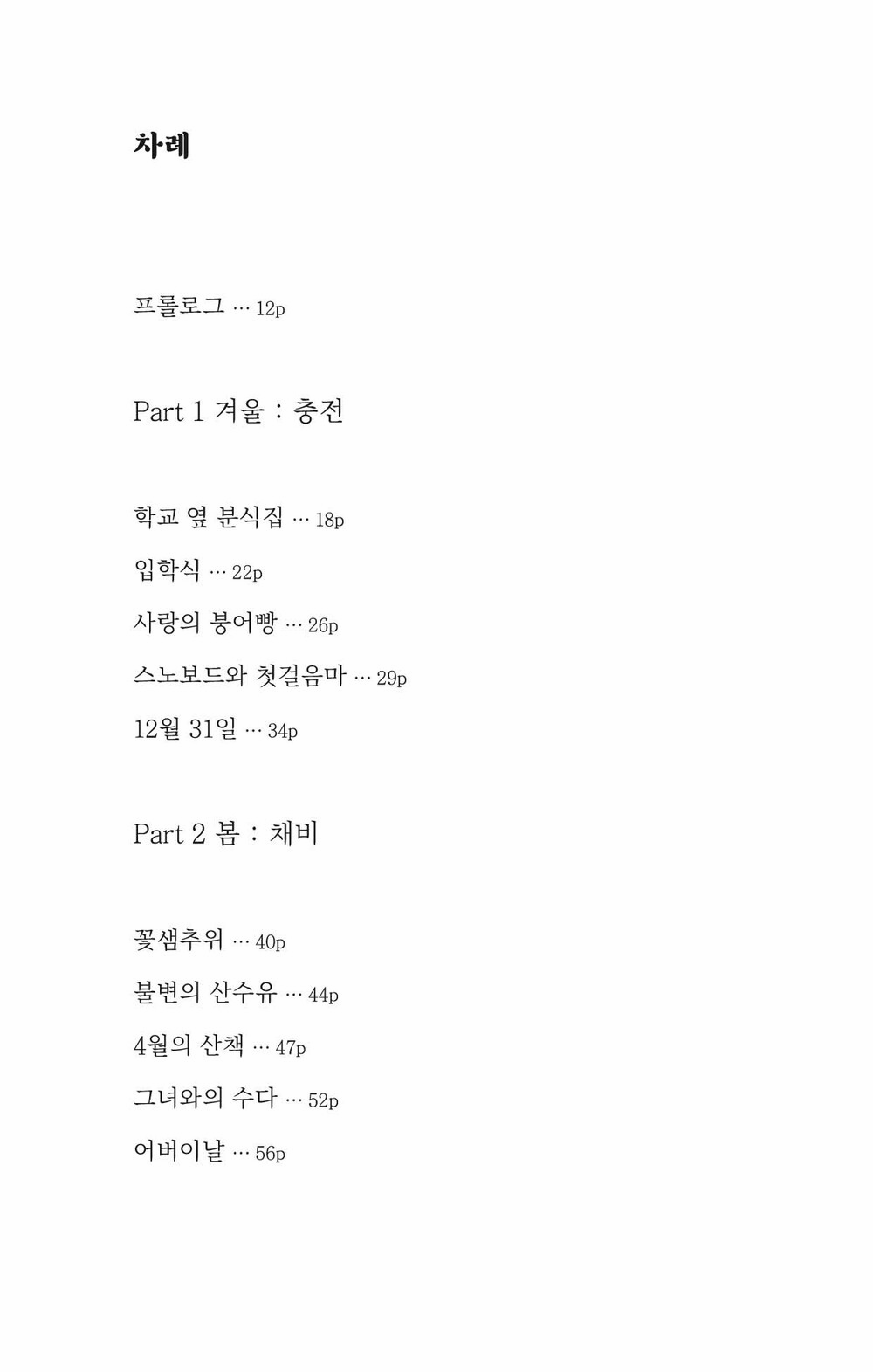 나도 그 런 너를 뒤로하고, 살벌한 바람을 맞으며 종종걸음을 친다. 볼이 새빨개진 채로. 봄인데 이렇 게 엉뚱하게 추울 일인가 투덜댄다. 새로운 계절을 환영하지 못하고, 지난 계절에 여운을 두 는 모양이 꼭 너 같다. 그저 기쁜 마음으로 맞이하면 될 것을. 42p. 꽃샘추위 중