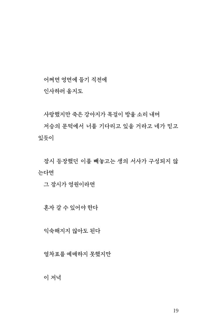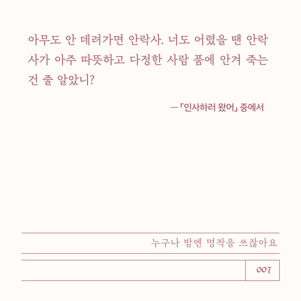 아무도 안 데려가면 안락사. 너도 어렸을 땐 안락사가 아주 따뜻하고 다정한 사람 품에 안겨 죽는 건 줄 알았니? -「인사하러 왔어」 중에서