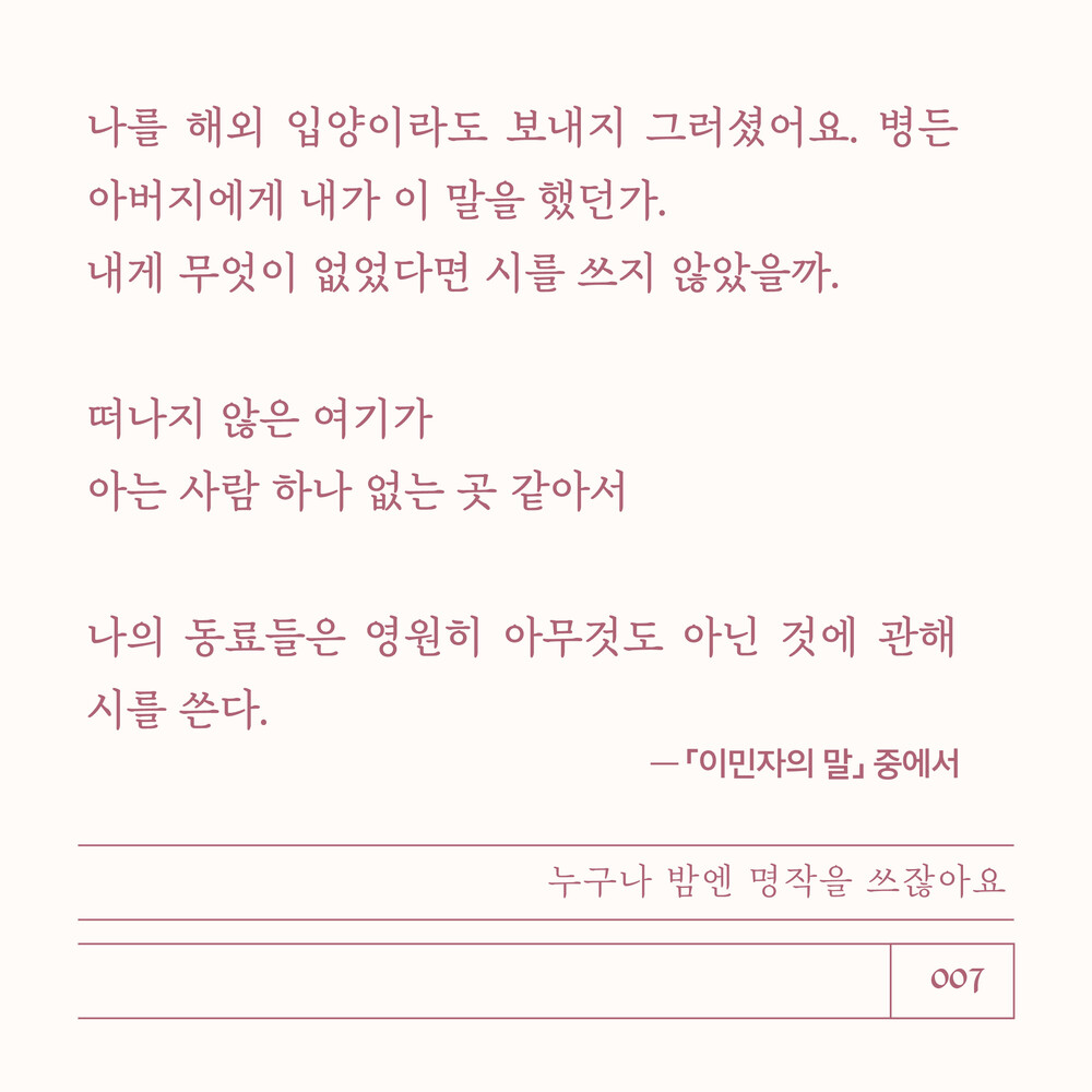 나의 동료들은 영원히 아무것도 아닌 것에 관해 시를 쓴다. -「이민자의 말」 중에서