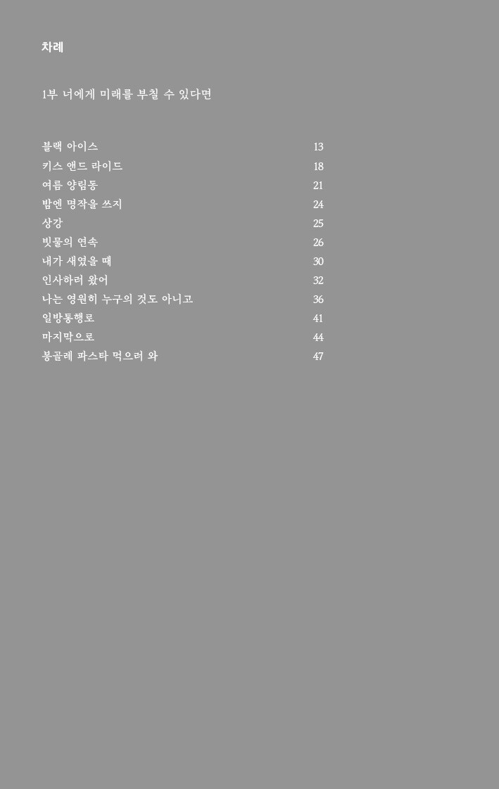 블랙 아이스/ 키스 앤드 라이드/ 여름 양림동/ 밤엔 명작을 쓰지/ 상강/ 빗물의 연속/ 내가 새였을 때/ 인사하러 왔어/ 나는 영원히 누구의 것도 아니고/ 일방통행로/ 마지막으로/ 봉골레 파스타 먹으러 와
