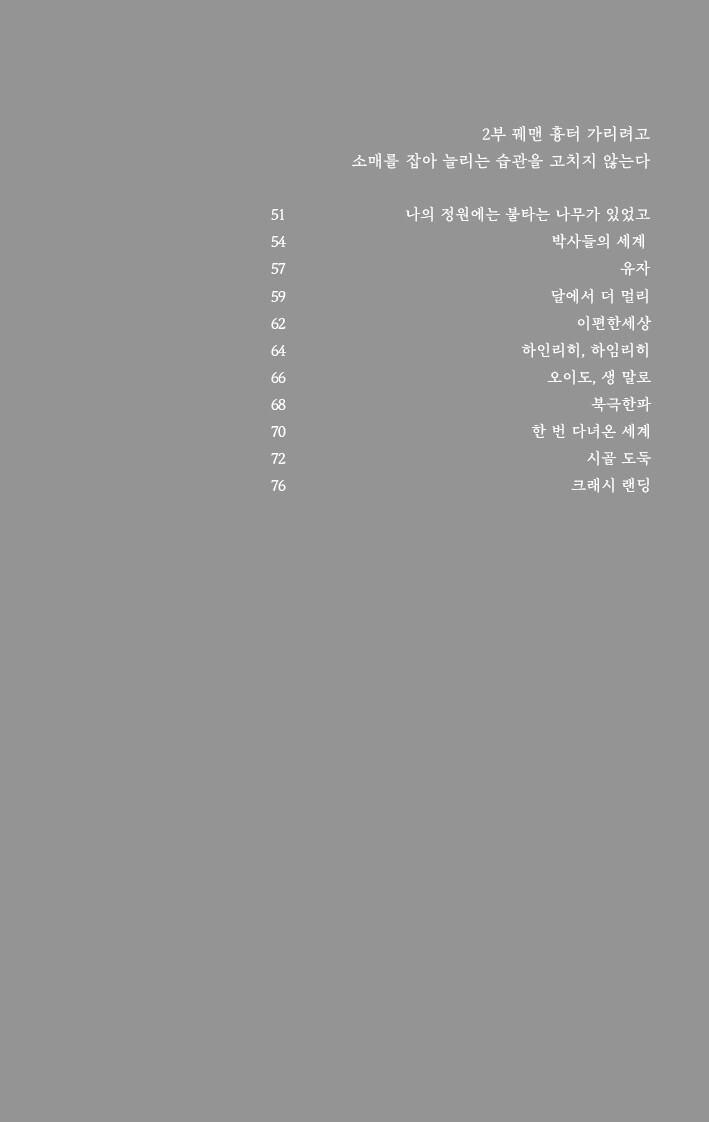 나의 정원에는 불타는 나무가 있었고/ 박사들의 세계/ 유자/ 달에서 더 멀리/ 이편한세상/ 하인리히, 하임리히/ 오이도, 생 말로/ 북극한파/ 한 번 다녀온 세계/ 시골 도둑/ 크래시 랜딩