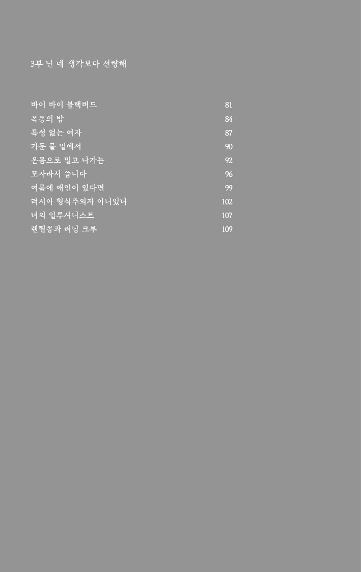 바이 바이 블랙버드/ 목동의 밤/ 특성 없는 여자/ 가둔 물 밑에서/ 온몸으로 밀고 나가는/ 모자라서 씁니다/ 여름에 애인이 있다면/ 러시아 형식주의자 아니었나/ 너의 일루셔니스트/ 렌틸콩과 러닝 크루