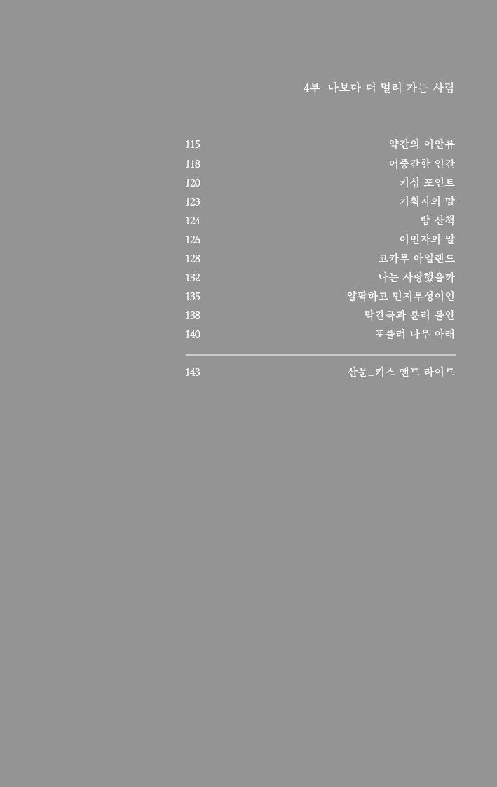 약간의 이안류/ 어중간한 인간/ 키싱 포인트/ 기획자의 말/ 밤 산책/ 이민자의 말/ 코카투 아일랜드/ 나는 사랑했을까/ 얄팍하고 먼지투성이인/ 막간극과 분리 불안/ 포플러 나무 아래