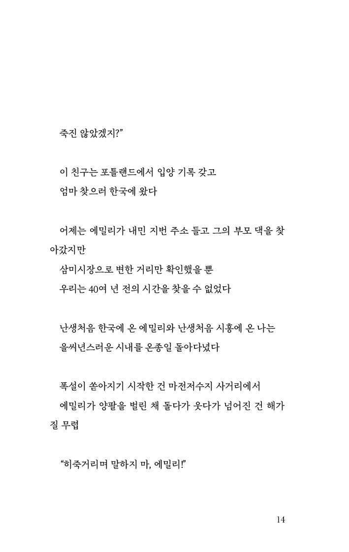 김이듬의 시 속에서 우리가 만나는 사람들도 그러하다. 40년 만에 한국을 찾은 에밀리가 찾아간 옛집은 흔적도 없이 사라졌고, 을씨년스러운 세월을 따라 변한 장소만 확인했을 뿐이다. 그리고 ‘나’에게도 이와 비슷한 일이 일어난다.