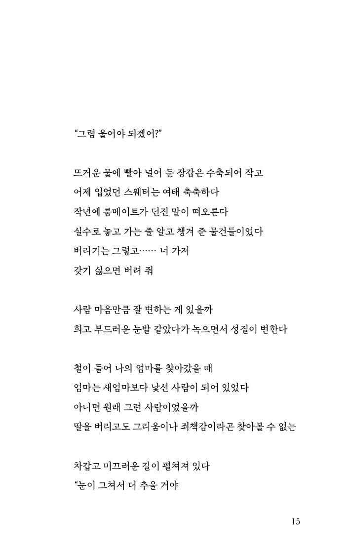 날이 밝았어 이제 밑도 끝도 없는 이 의자에서 일어나 마지막으로 새어머니를 만나러 가야 한다고 작년에도 재작년에도 그렇다 서른 번 넘게 지껄였다 -「마지막으로」 중에서