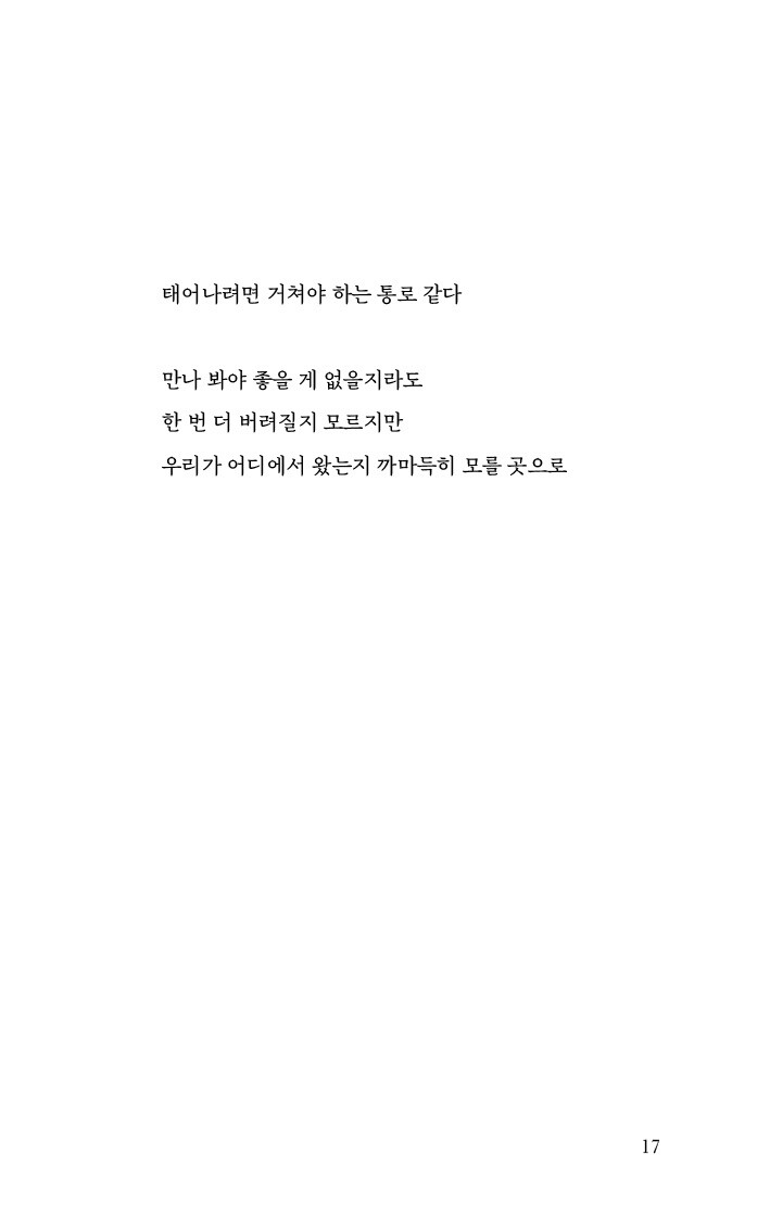 이 조류는 태초부터 날지 않았을지, 지상의 먹이들 놔두고 굳이 날 필요 없으니까 서서히 날개가 퇴화하여 날 수 없게 된 건지, 쓸 수 없는 날개는 왜 생겨난 건지…… 내가 새였을 때, 나는 고난이 오면 도피했다. 스트레스받지 않았다. 멀리 날아가 버렸다. - 「내가 새였을 때」 중에서