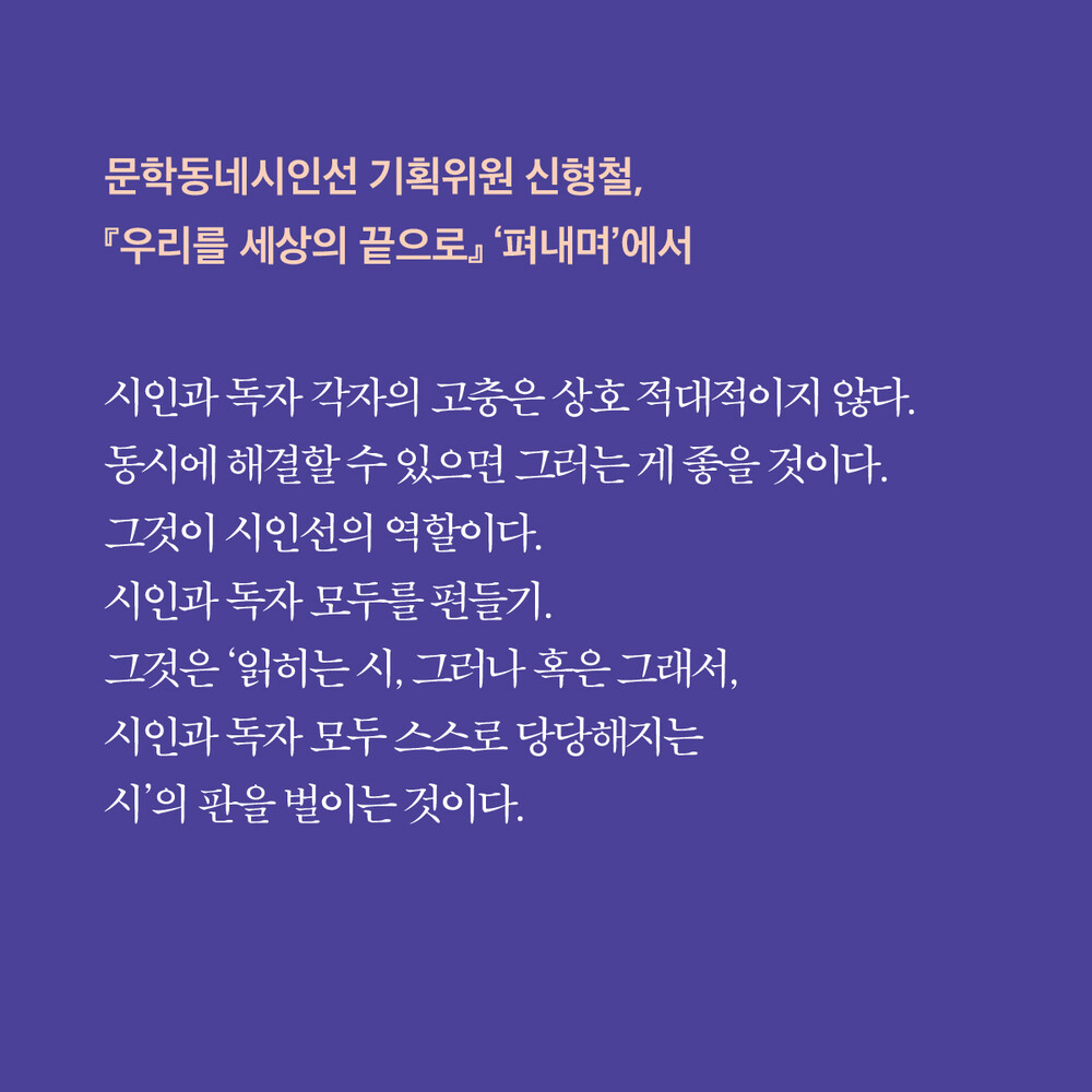 _문학동네시인선 기획위원 신형철, 『우리를 세상의 끝으로』 ‘펴내며’에서