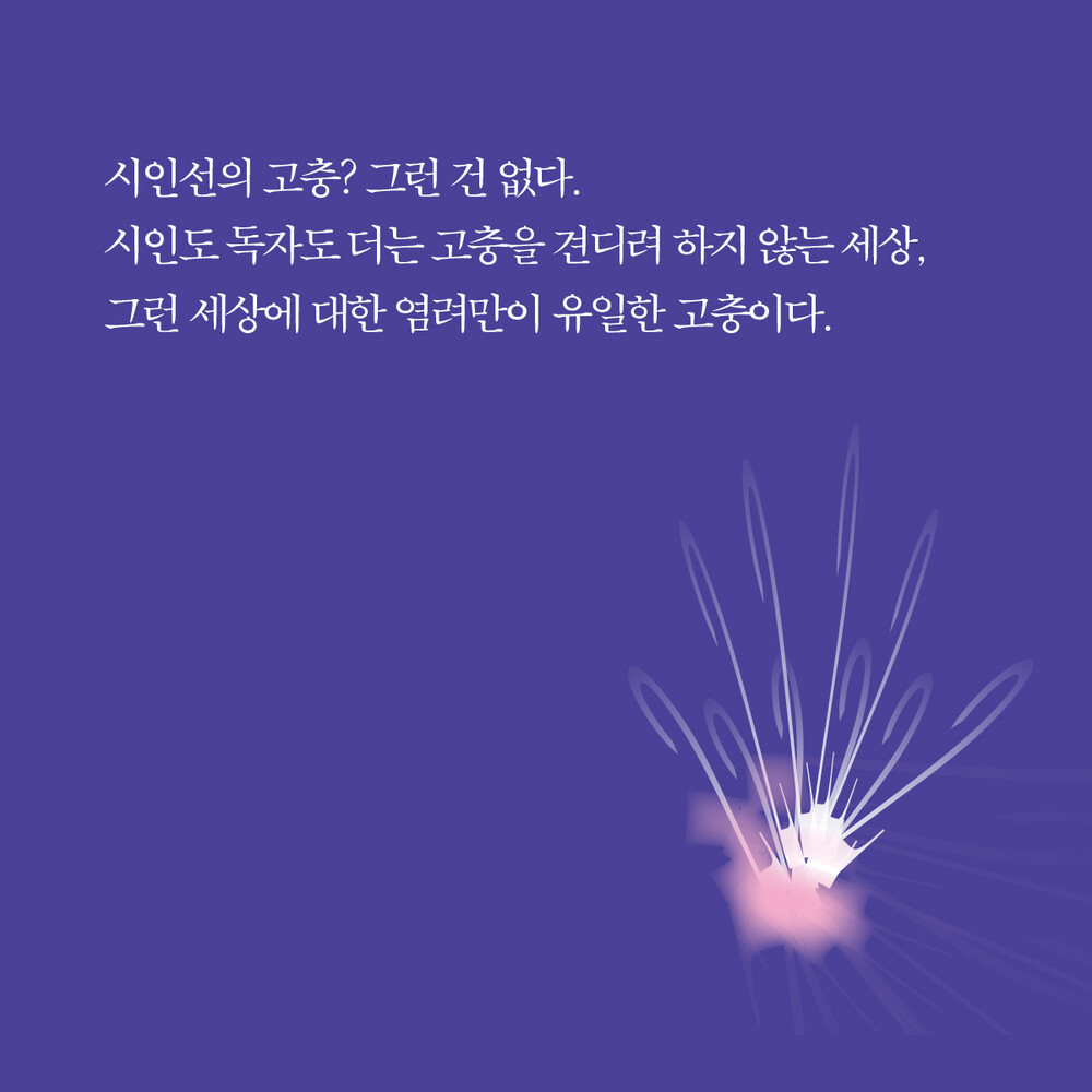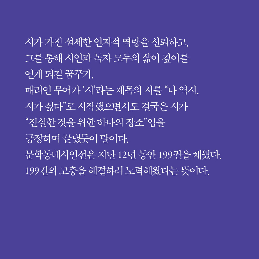 시인과 독자 각자의 고충은 상호 적대적이지 않다. 동시에 해결할 수 있으면 그러는 게 좋을 것이다. 그것이 시인선의 역할이다. 시인과 독자 모두를 편들기. 그것은 ‘읽히는 시, 그러나 혹은 그래서, 시인과 독자 모두 스스로 당당해지는 시’의 판을 벌이는 것이다. 시가 가진 섬세한 인지적 역량을 신뢰하고, 그를 통해 시인과 독자 모두의 삶이 깊이를 얻게 되길 꿈꾸기. 매리언 무어가 ‘시’라는 제목의 시를 “나 역시, 시가 싫다”로 시작했으면서도 결국은 시가 “진실한 것을 위한 하나의 장소”임을 긍정하며 끝냈듯이 말이다. 문학동네시인선은 지난 12년 동안 199권을 채웠다. 199건의 고충을 해결하려 노력해왔다는 뜻이다. 시인선의 고충? 그런 건 없다. 시인도 독자도 더는 고충을 견디려 하지 않는 세상, 그런 세상에 대한 염려만이 유일한 고충이다.