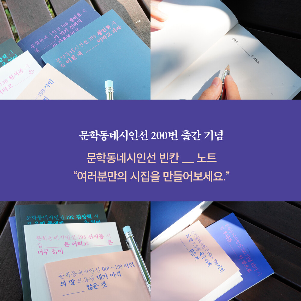 문학동네시인선이 200번째 시집을 맞아 기념 티저 시집을 펴낸다. 2011년 1월, 최승호, 허수경, 송재학의 시를 선보이며 시작한 문학동네시인선은 ‘보다 젊은 감각과 깊은 사유를 지향한다!’라는 캐치프레이즈를 내걸고 시작한 만큼, 개성 있는 목소리를 가진 젊은 시에 주목해왔다. ‘젊은’ 시란 생물학적 나이와 무관한 새로운 감각에 대한 지향인 동시에 재능 있는 신인에 주목해 ‘첫 시집’ 자리를 많이 마련하겠다는 의지의 표명이었다. 1번부터 199번까지 문학동네시인선을 통해 첫 시집을 낸 시인은 박준, 이은규, 신철규, 이원하, 이현호, 최현우, 김희준, 고명재 등 45명으로 전체 시집의 4분의 1 이상을 차지한다. 특히 박준 시인의 첫 시집 『당신의 이름을 지어다가 며칠은 먹었다』는 출간 10년째인 올해 초 60쇄, 20만 부 제작이라는 놀라운 기록을 남기기도 하였다. 첫 시집에서만 느낄 수 있는 특별한 열기와 자유로움에 독자가 보내온 호응은 꾸준하고 뜨거웠다. 요컨대 199권의 시집은 젊은 시인과 젊은 시인선이 서로의 가능성과 패기를 믿고 함께 만들어온 ‘시의 집’이었으며, 그곳을 찾은 독자 수가 늘어가면서 지붕은 탄탄해지고 마당도 넓어져 절판 시집 없이 더 많은 기회를 품은 집이 될 수 있었다는 것이다.