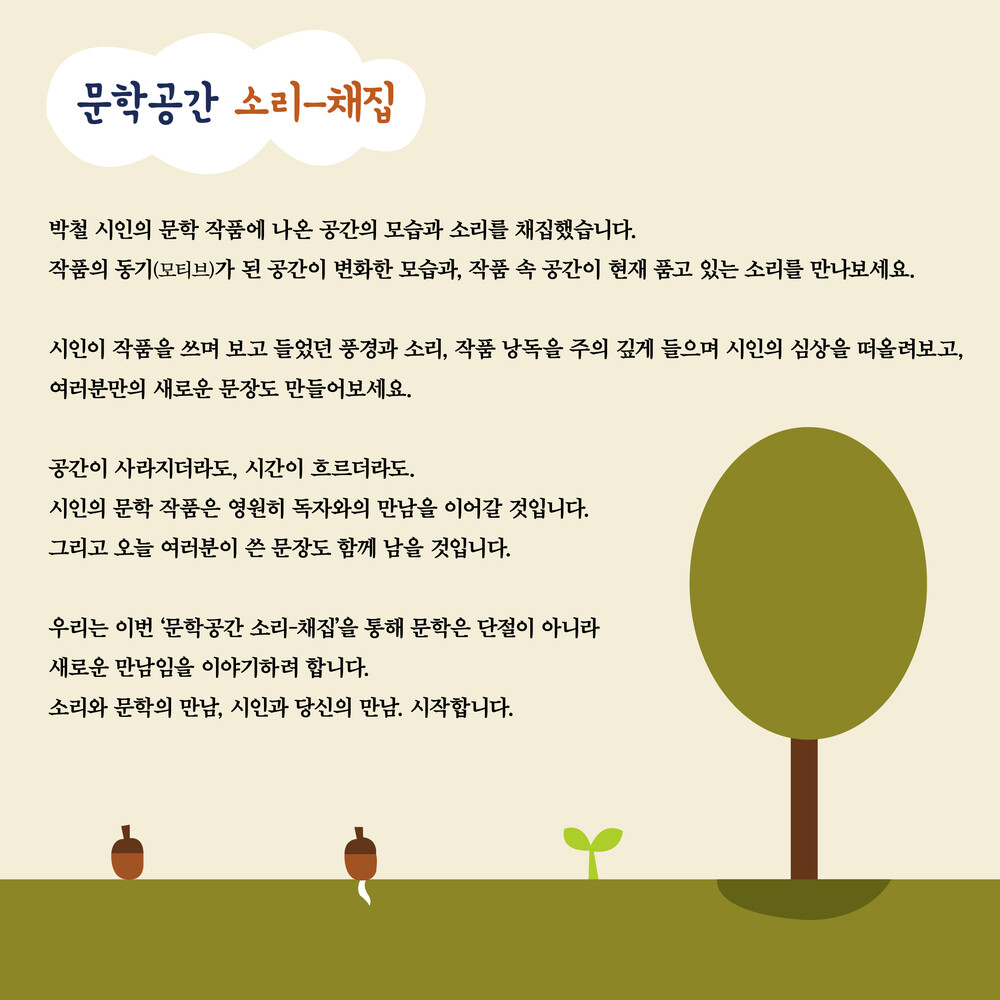 우리는 이번 '문학공간 소리-채집'을 통해 문학은 단절이 아니라 새로운 만남임을 이야기하려 합니다. 소리와 문학의 만남, 시인과 당신의 만남. 시작합니다.
