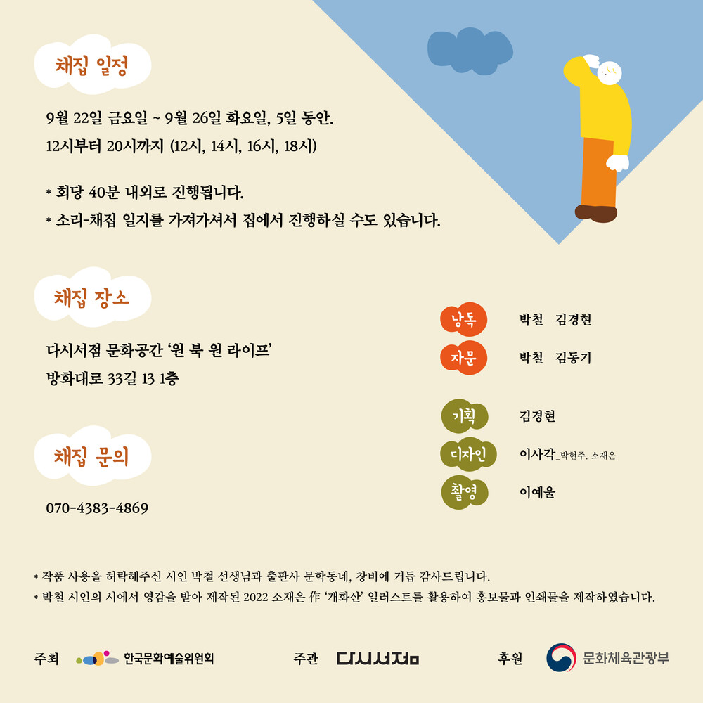 시인이 작품을 쓰며 보고 들었던 풍경과 소리, 작품 낭독을 주의 깊게 들으며 시인의 심상을 떠올려보고, 여러분만의 새로운 문장도 만들어보세요.