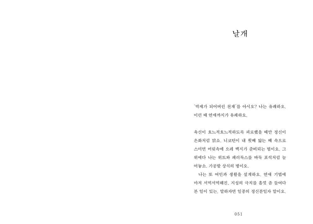 나는 불현듯이 겨드랑이가 가렵다. 아하, 그것은 내 인공의 날개가 돋았던 자국이다. 오늘은 없는 이 날개, 머릿속에서는 희망과 야심의 말소된 페이지가 딕셔너리 넘어가듯 번뜩였다.