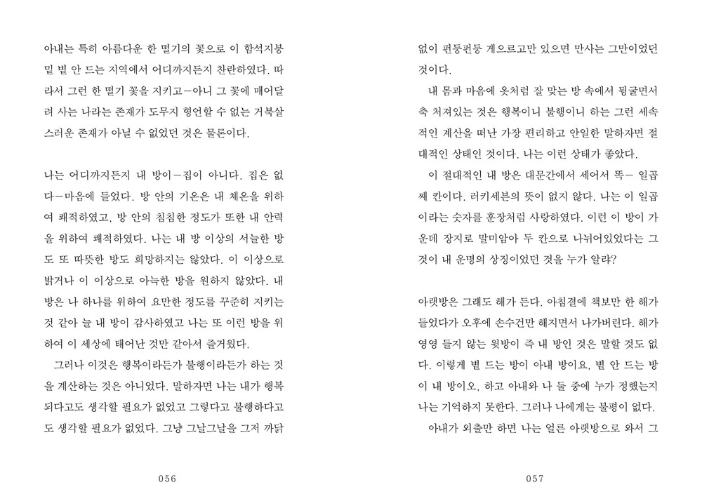 그리운 지난날의 기억들 변한다. 모든 것이 변한다. 아무리 그가 이 방 덧문을 첩첩 닫고 1년 열두 달을 수염도 안 깎고 누워있다 하더라도 세상은 그 잔인한 ‘관계’를 가지고 담벼락을 뚫고 스며든다. 오래간만에 잠다운 잠을 참 한참 늘어지게 잤다. 머리가 차츰차츰 맑아 들어온다.