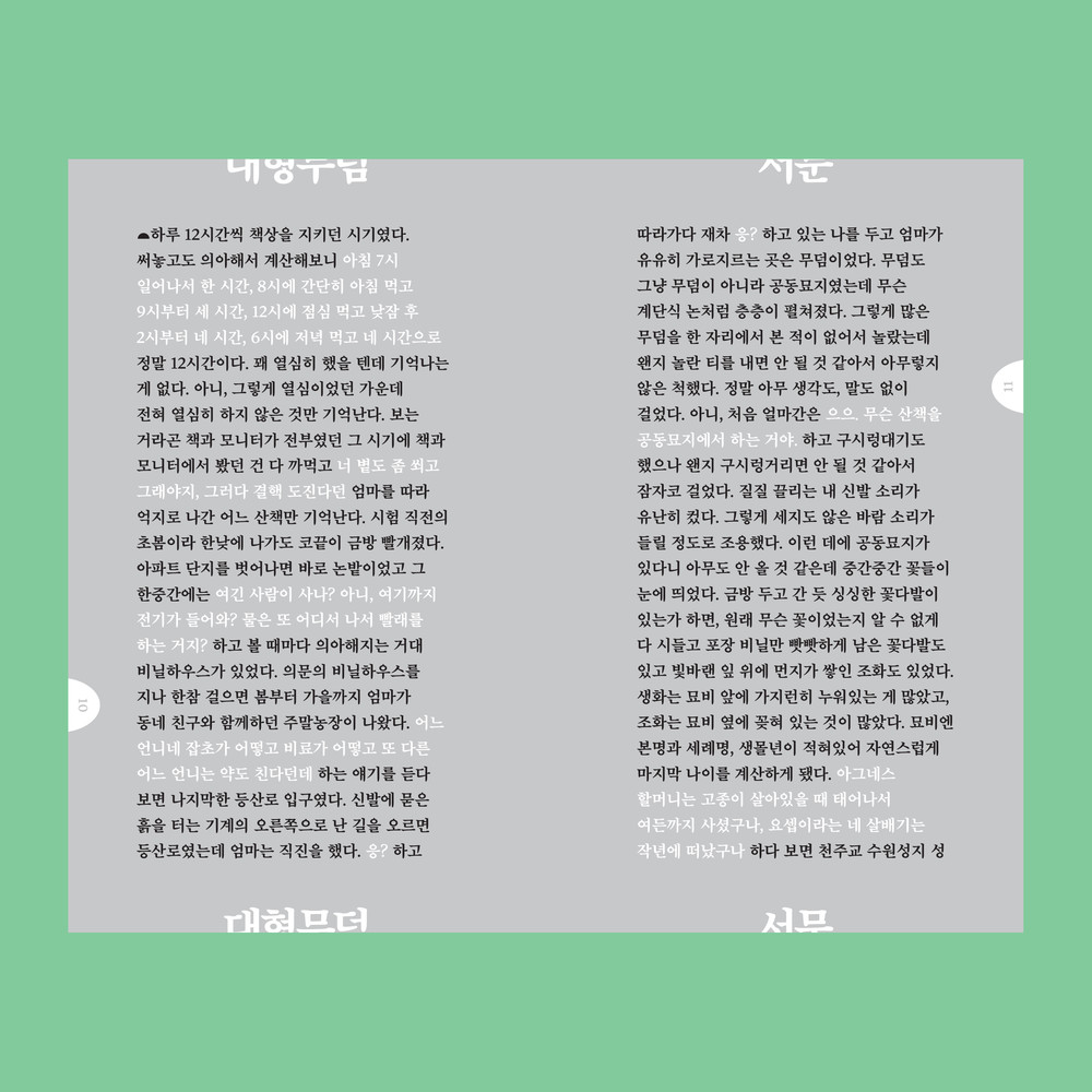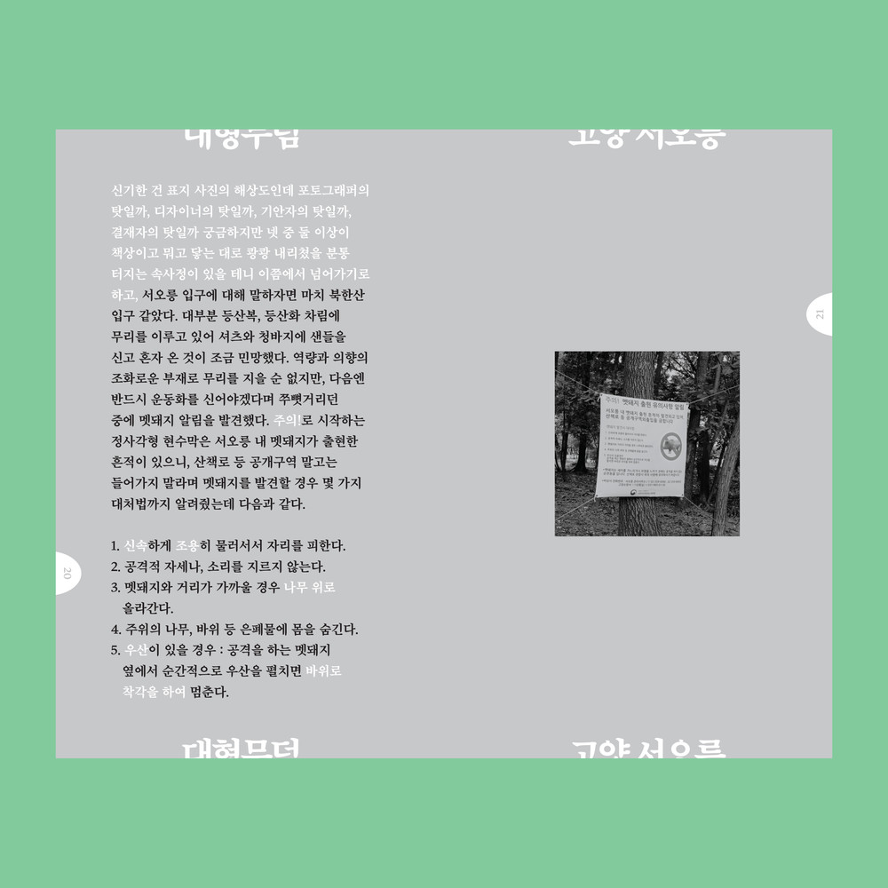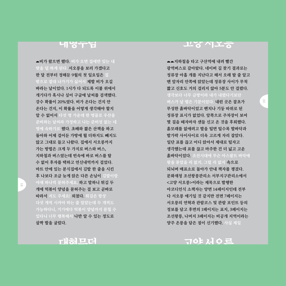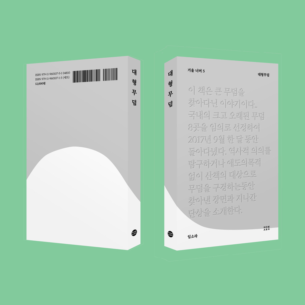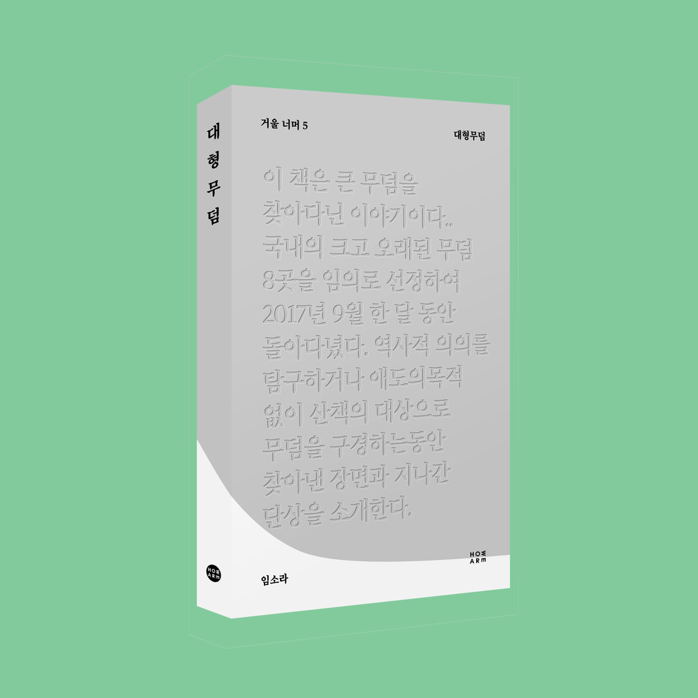 『대형무덤 : 거울 너머 5』 / 임소라 105*170mm 164페이지 12,000원 ISBN 979-11-960107-5-1 (04810) 거울은 물체를 비추거나 왜곡합니다. 글은 글쓴이를 비추거나 왜곡합니다. 2017년, 하우위아에서 거울 너머를 바라보고 글 너머를 상상하는 산문집 너머>를 펴냅니다. 매호 하나의 주제 아래 논픽션(홀수호)과 픽션(짝수호)의 형태로 두 달에 한 번 발행하며 총 6권으로 마무리됩니다. 너머> 시리즈 5호인 『대형무덤』은 큰 무덤을 찾아다닌 이야기입니다. 국내의 크고 오래된 무덤 8곳을 임의로 선정하여 2017년 9월 한 달 동안 돌아다녔습니다. 역사적 의의를 탐구하거나 애도의 목적 없이 산책의 대상으로 무덤을 구경하는 동안 찾아낸 장면과 지나간 단상을 소개합니다.