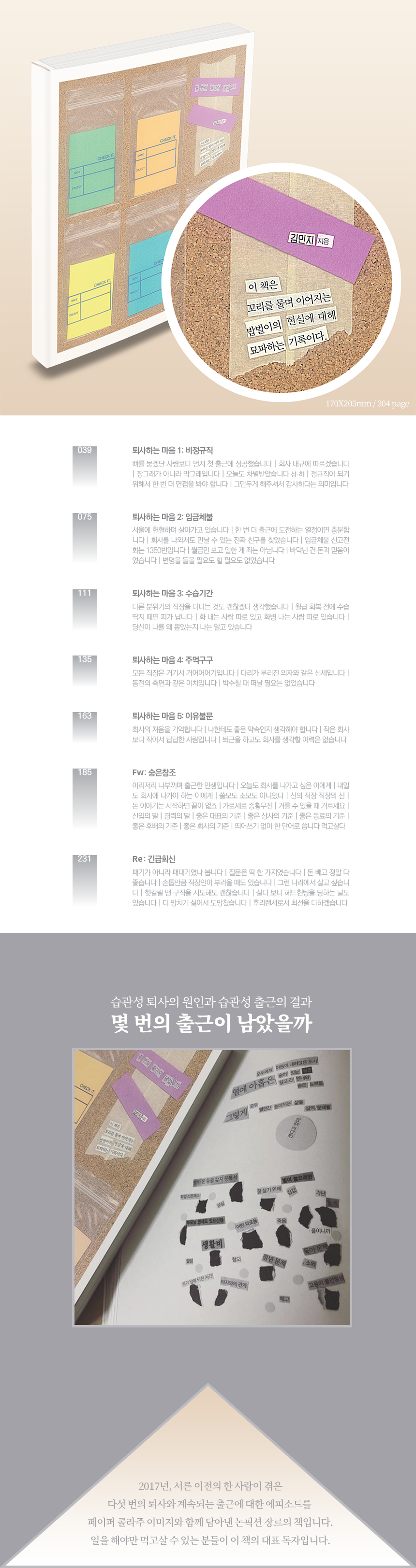 퇴사하는 마음 1: 비정규직 뼈를 묻겠단 사람보다 먼저 첫 출근에 성공했습니다 | 회사 내규에 따르겠습니다 | 장그래가 아니라 막그래입니다 | 오늘도 차별받았습니다 상·하 | 정규직이 되기 위해서 한 번 더 면접을 봐야 합니다 | 그만두게 해주셔서 감사하다는 의미입니다 퇴사하는 마음 2: 임금체불 서울에 헌혈하며 살아가고 있습니다 | 한 번 더 출근에 도전하는 열정이면 충분합니다 | 회사를 나와서도 만날 수 있는 진짜 친구를 찾았습니다 | 임금체불 신고전화는 1350번입니다 | 월급만 보고 일한 게 죄는 아닙니다 | 바닥난 건 돈과 믿음이었습니다 | 변명을 들을 필요도 할 필요도 없었습니다 퇴사하는 마음 3: 수습기간 다른 분위기의 직장을 다니는 것도 괜찮겠다 생각했습니다 | 월급 회복 전에 수습 딱지 떼면 피가 납니다 | 화 내는 사람 따로 있고 화병 나는 사람 따로 있습니다 | 당신이 나를 왜 뽑았는지 나는 알고 있습니다 퇴사하는 마음 4: 주먹구구 모든 직장은 거기서 거어어어기입니다 | 다리가 부러진 의자와 같은 신세입니다 | 동전의 측면과 같은 이치입니다 | 박수칠 때 떠날 필요는 없었습니다 퇴사하는 마음 5: 이유불문 회사의 처음을 기억합니다 | 나한테도 좋은 약속인지 생각해야 합니다 | 작은 회사보다 작아서 답답한 사람입니다 | 퇴근을 하고도 회사를 생각할 여력은 없습니다 Fw: 숨은참조 이리저리 나부끼며 출근한 인생입니다 | 오늘도 회사를 나가고 싶은 이에게 | 내일도 회사에 나가야 하는 이에게 | 쓸모도 소모도 아니었다 | 신의 직장 직장의 신 | 돈 이야기는 시작하면 끝이 없죠 | 가로세로 종횡무진 | 거를 수 있을 때 거르세요 | 신입의 말 | 경력의 말 | 좋은 대표의 기준 | 좋은 상사의 기준 | 좋은 동료의 기준 | 좋은 후배의 기준 | 좋은 회사의 기준 | 띄어쓰기 없이 한 단어로 씁니다 먹고살다 Re: 긴급회신 패기가 아니라 패대기였나 봅니다 | 질문은 딱 한 가지였습니다 | 돈 빼고 정말 다 좋습니다 | 손톱만큼 직장인이 부러울 때도 있습니다 | 그런 나라에서 살고 싶습니다 | 헷갈릴 땐 구직을 시도해도 괜찮습니다 | 살다보니 헤드헌팅을 당하는 날도 있습니다 | 더 망치기 싫어서 도망쳤습니다 | 후리랜서로서 최선을 다하겠습니다 에필로그: 습관성 출근의 결과
