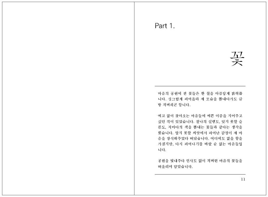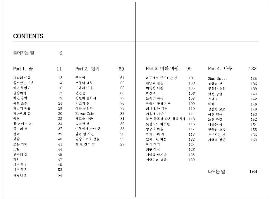 20대 초반을 지나며 기록한 모든 마음들이 하나의 공원을 이루었다는 컨셉으로 책을 엮었습니다. 공원을 이루는 수많은 요소들 중 '꽃, 벤치, 비와 바람, 나무'를 책의 네 가지 파트로 선정하였습니다. 파트마다 갖는 의미를 따라서 글들을 구성하였습니다. 책장을 넘기는 행위는 공원을 산책하는 일과 닮아있습니다. 파트마다 가진 분위기를 따라 책장을 넘기는 동안, 마음이라는 공원을 산책할 수 있습니다.
