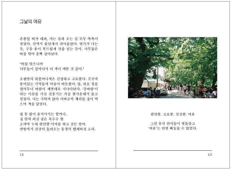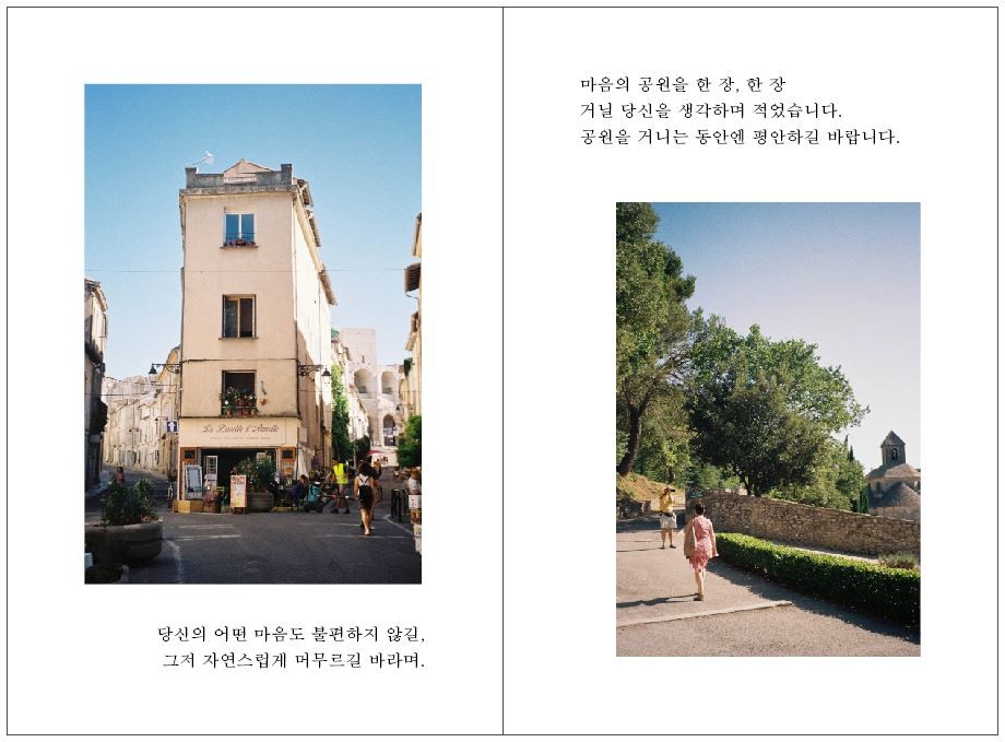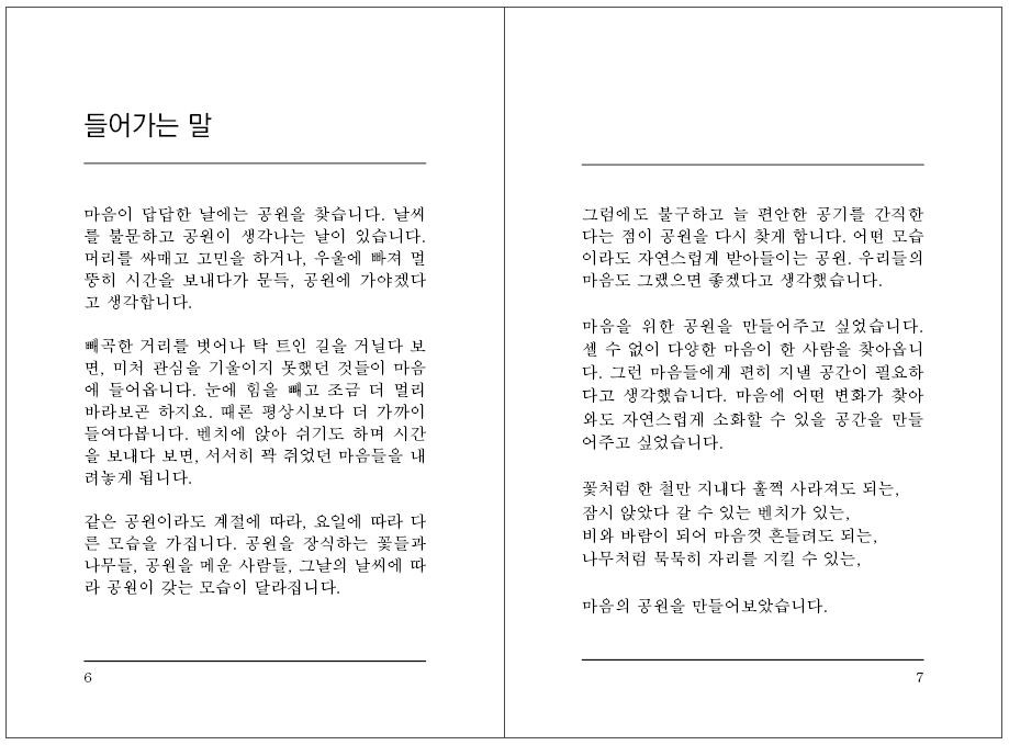 ‘모든 사람의 마음에는 저마다 아늑한 공원이 하나씩 있습니다. 공원의 존재가 느껴진다면, 모든 마음을 더 찬찬히 곱씹을 수 있을 거라 믿습니다.