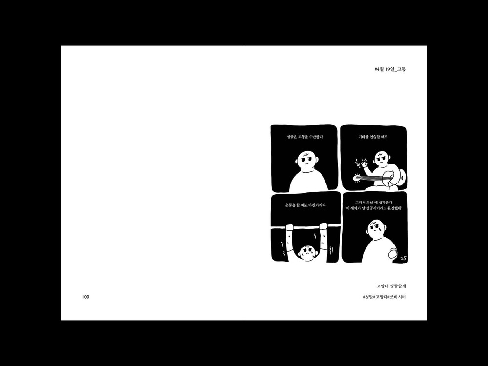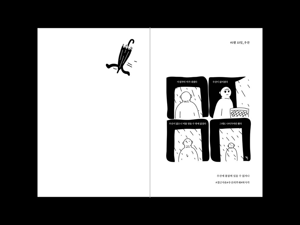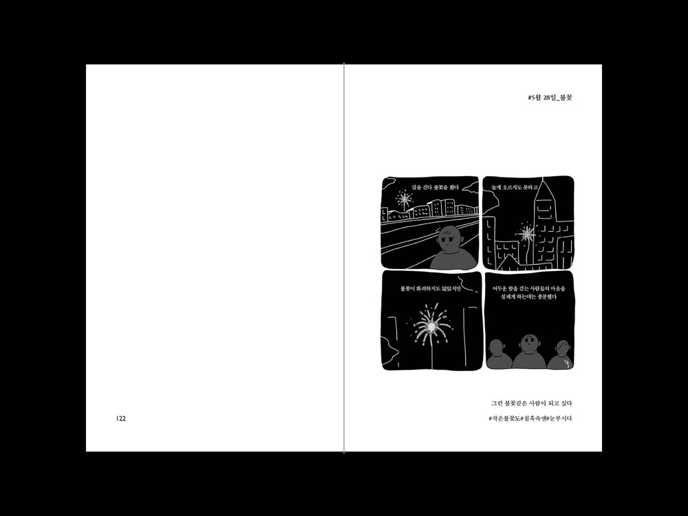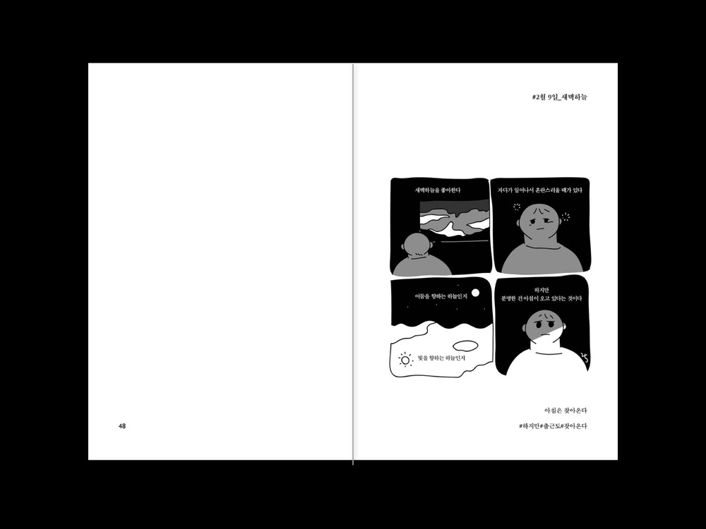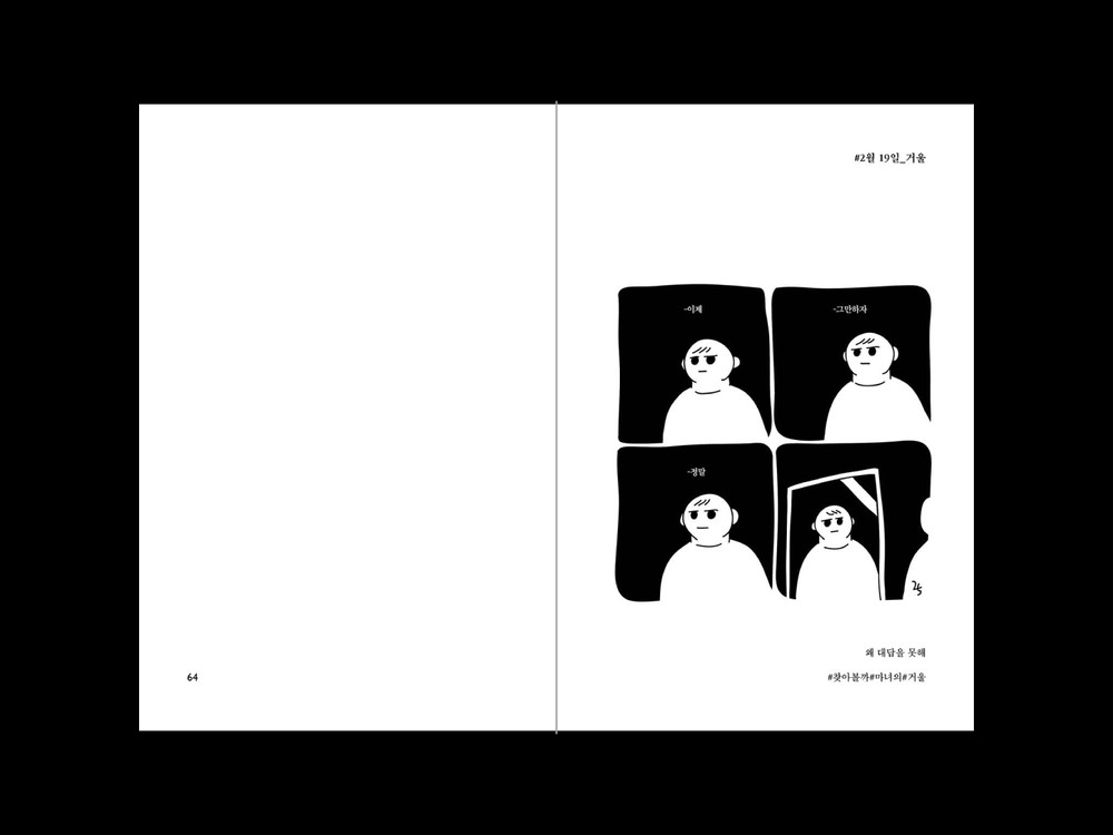 이별 후… 다시 바라본 세상은 예전과 조금 달랐습니다. 온통 우울했고, 어둡게 보였죠. 이 책은 그 우울하고, 어두운 시기를 건너며 그린 만화들이 모여 만들어진 것입니다. 이 만화들을 그리며 전 조금씩 어두운 터널들을 생각보다 빠른 속도로 지나갔는데, 이 만화를 보시는 독자분들도 그럴 수 있었으면 좋겠습니다. 지금 당장은 분명 힘들지도 몰라요. 그러나 확실한 건 당신은 지금 충분히 잘 버텨나가고 있다는 거고, 결국 이 어두운 시간은 다 지나갈 겁니다. 전보다 훨씬 더 성장한 모습으로 말이에요.