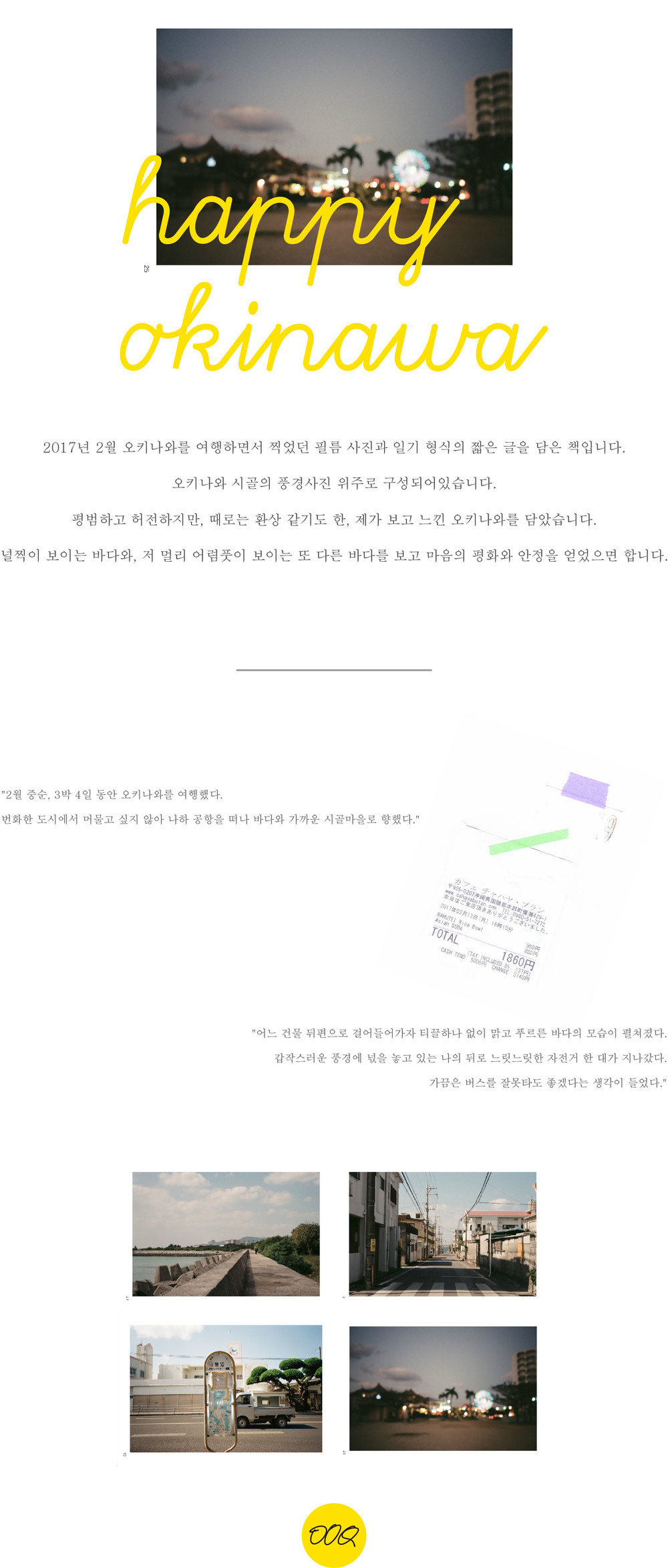 2017년 2월 오키나와를 여행하면서 찍었던 필름 사진과 일기 형식의 짧은 글을 담은 책입니다. 오키나와 시골의 풍경사진 위주로 구성되어있습니다. 평범하고 허전하지만, 때로는 환상 같기도 한, 제가 보고 느낀 오키나와를 담았습니다. 널찍이 보이는 바다와, 저 멀리 어렴풋이 보이는 또 다른 바다를 보고 마음의 평화와 안정을 얻었으면 합니다. (A3size 포스터 포함)