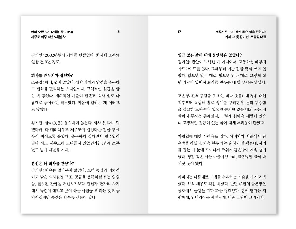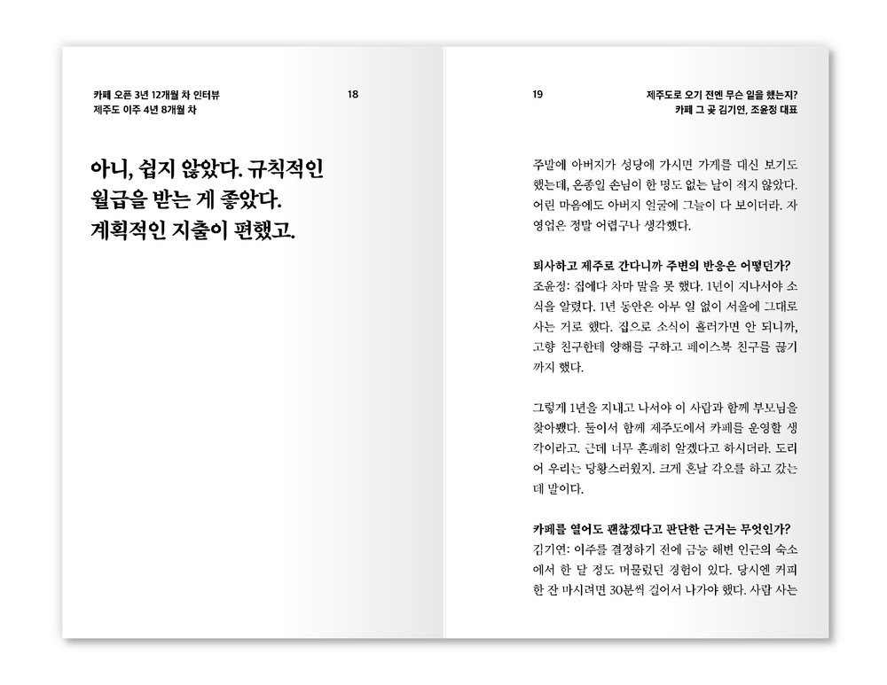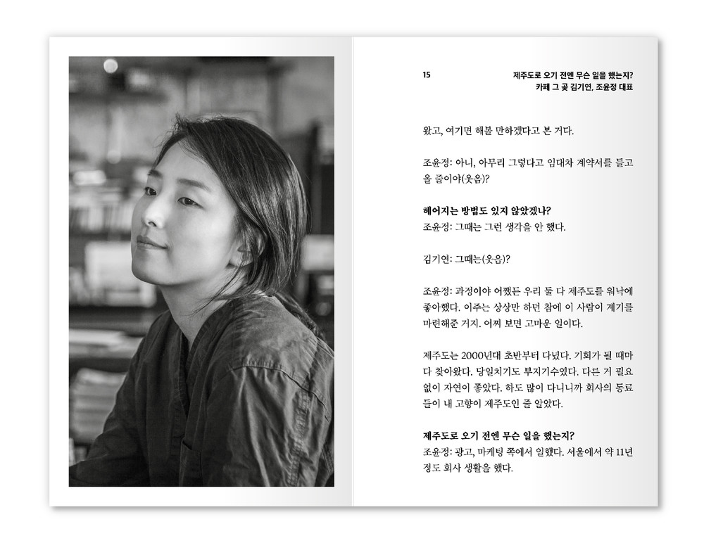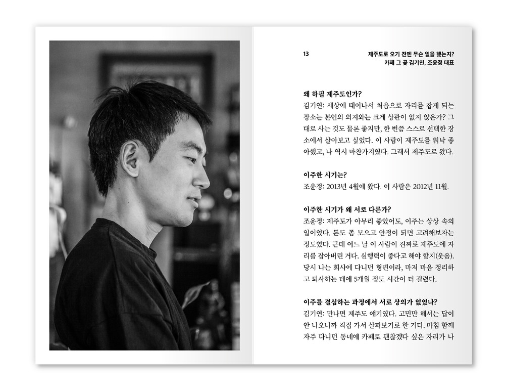제주의 오픈 3년 이하 이주민의 가게들과 인터뷰했다. 카페, 민박, 서점, 빵집 등 업종은 다양하다. 소위 도시의 반복되는 일상에서 탈출한 사람들의 공간이며, 십중팔구 부러움의 대상일 거다. 놀고먹는 것으로 보이기도 한다. 그들의 실제 삶에 대해 취재했다. 편집되어 소비되는 환상의 이면에 어떤 현실적인 고민과 노력이 있는지 묻는다. 이주를 통해 바랐던 삶의 방식을 일궈내고 있는가?