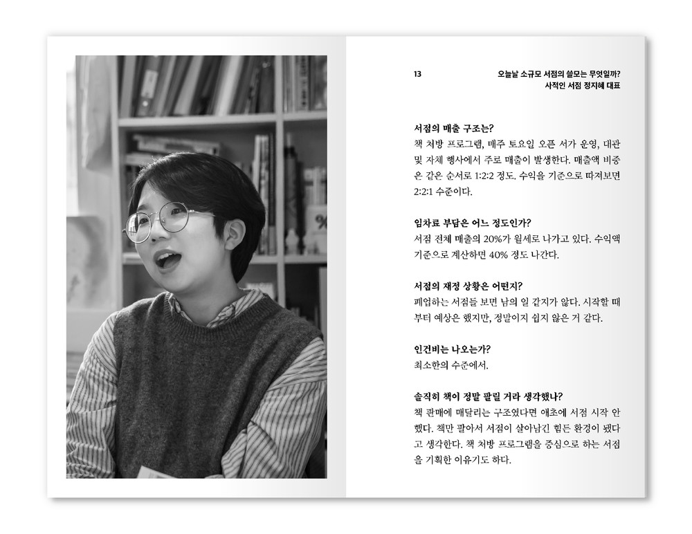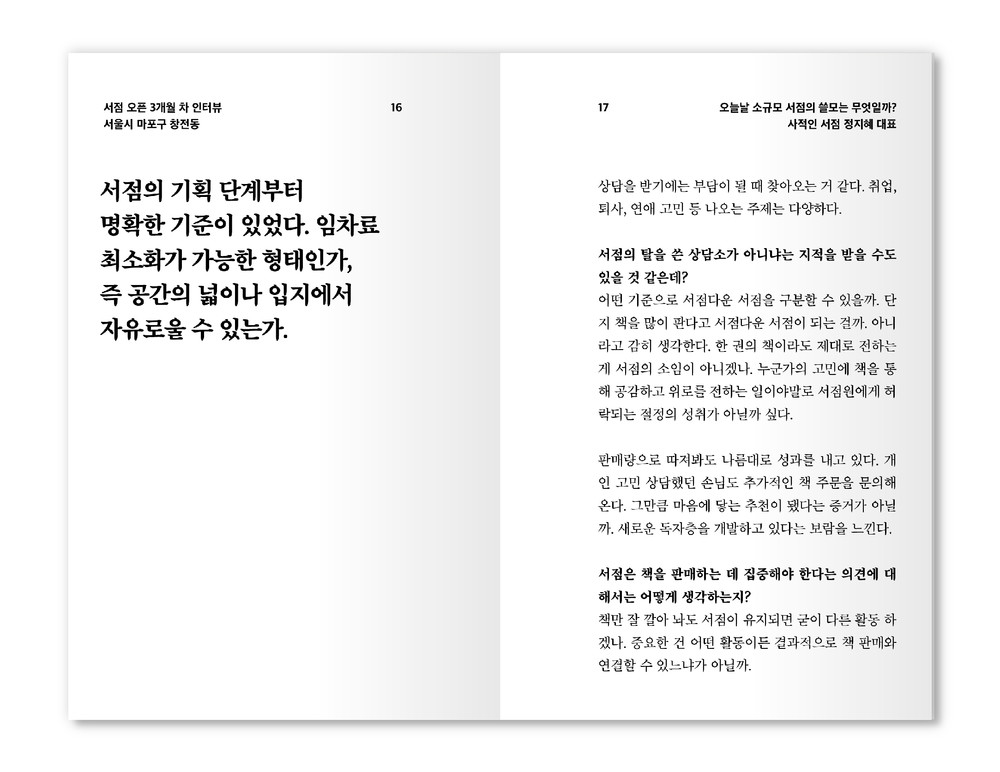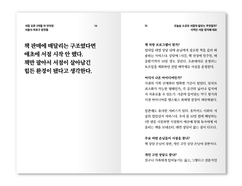 술이나 커피를 파는 서점, 디자인 스튜디오를 겸하는 서점, 일대일 상담제로 운영하는 서점 등을 인터뷰했다. 저마다의 방식으로 생존을 모색하는 서울의 소규모 서점들이다. 서점 매출 다각화의 득실을 따져본다. 재정에 실제로 도움이 되는지, 전문성 확보에 부담은 없는지, 차라리 음료를 중심에 두지 왜 굳이 돈도 안 되는 책에 공을 들이는지 묻는다. 책이 정말 팔릴 거라 생각했나?