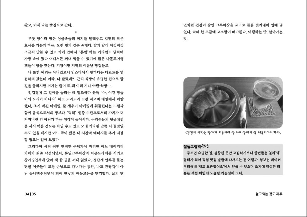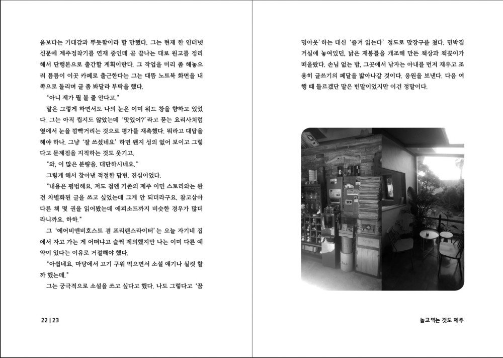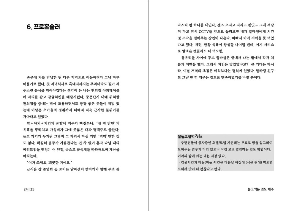 4. 책 소개: 자유로운 싱글이 홀로 떠난 제주여행에서 여러 가지 ‘혼행의 기술’들을 깨우치는 동시에, 혼자만의 사색과 사람들과의 만남을 통해 앞으로의 꿈과 사랑을 찾아간다는 이야기다. 소설로서의 내러티브를 갖춘 가운데, 감성적인 에세이와 더불어 중간 중간 실용적인 여행정보까지 담고 있다.