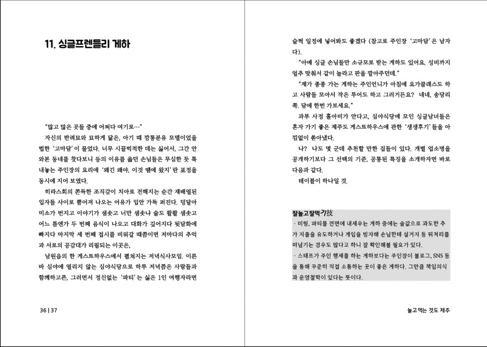 5. 기획 의도: ‘혼자 하는 제주여행’은 가히 트렌드라 할 만하다. 실제로 제주도를 가보면 ‘혼행족’들과 ‘1인 손님’들을 심심찮게 볼 수 있다. 바로 이런 싱글들을 위해 단순한 맛집 소개 이상의, 혼행의 노하우와 접근법을 전하려 노력했고 궁극적으로는 ‘삶이라는 여행’에 관해 얘기하고자 하였다.