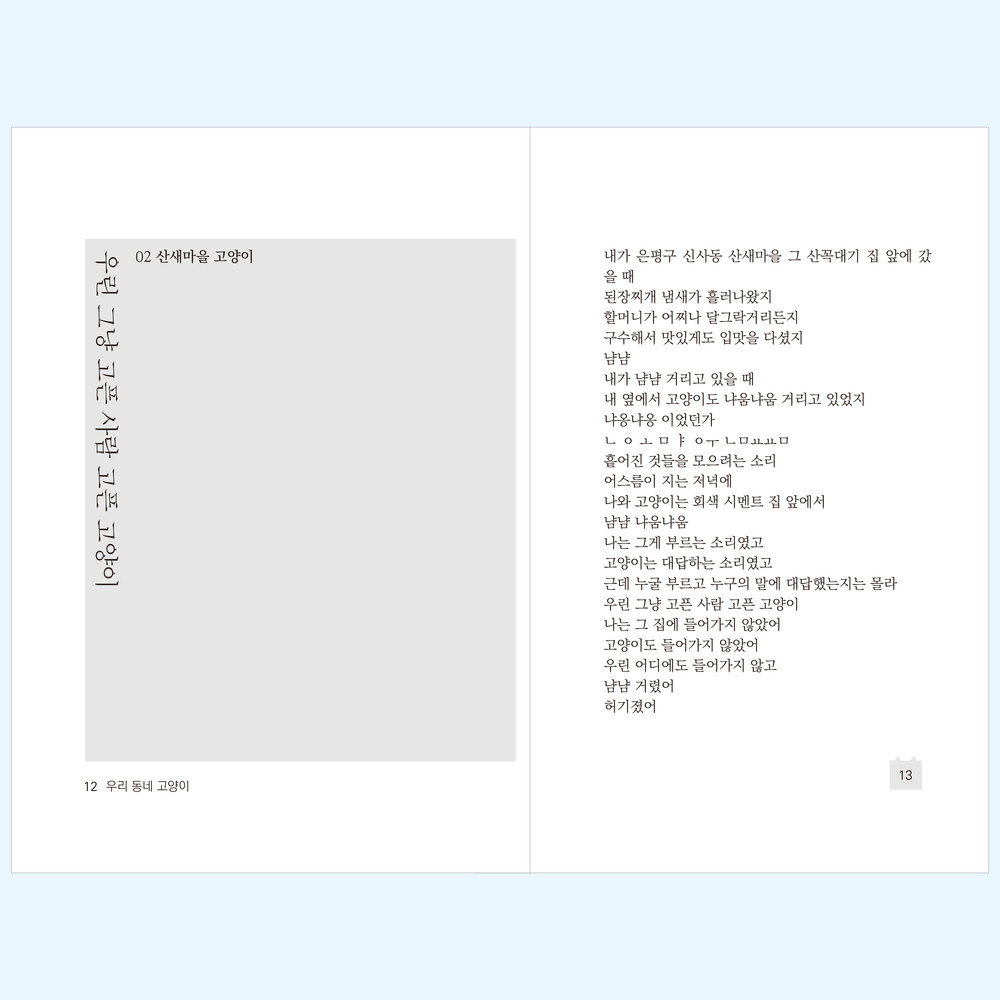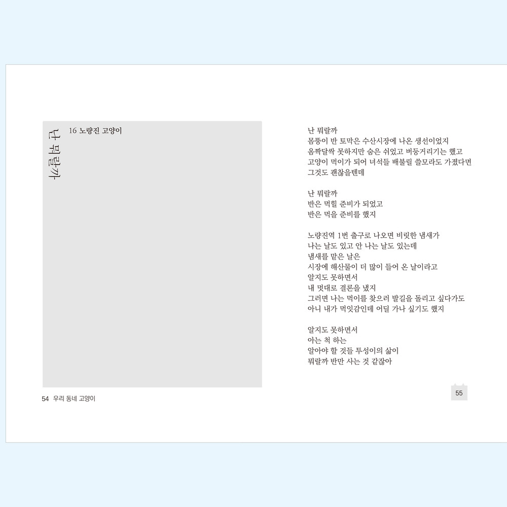 오직 고양이로 채워진 시이지만 이 책에 나오는 고양이들은 다른 누군가에게는 강아지로 바뀔 수 있고 친구나 가족 연인으로 읽힐 수도 있다. 사랑하는 감정을 담고 들여다보면 잊을 수 없는 장면이 되어 남으니까. 황부농은 고양이를 만났던 풍경들을 펼쳐보인다. 동네에서 만난 고양이들에 대해 주로 썼고 키우는 고양이들과 고양이와 관련된 시도 읽어 볼 수 있다. <우리 동네 고양이>는 고양이에 의한 고양이를 위한 고양이에 대한 시집이라 할 수 있다.