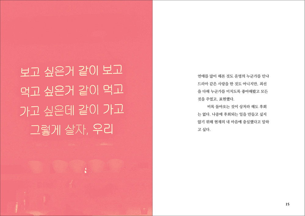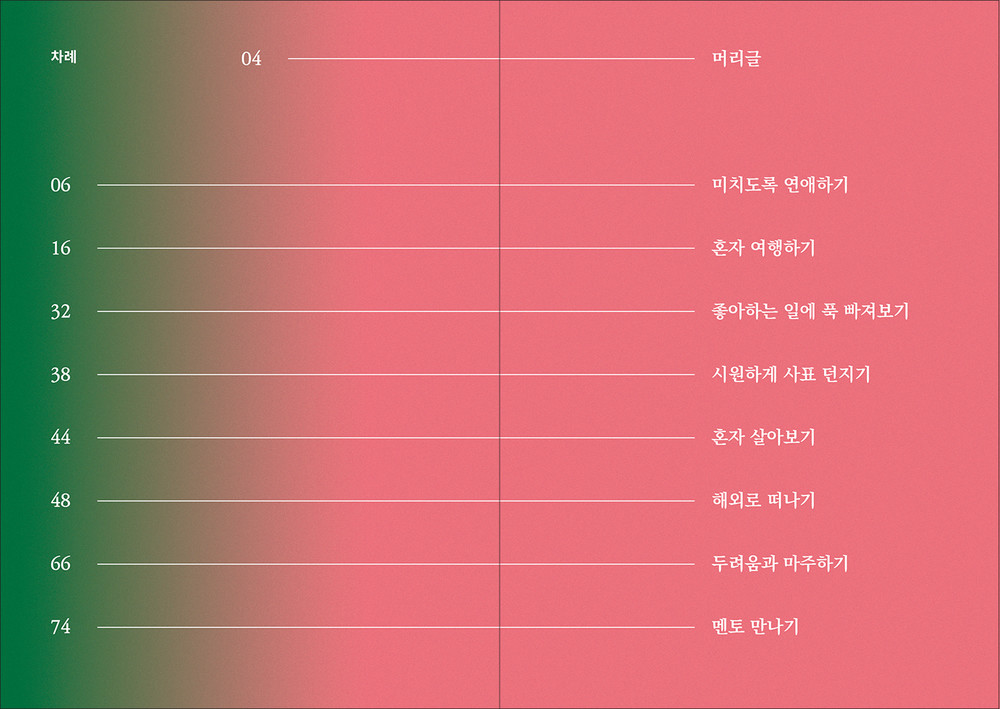 어느 날 SNS의 지난 글을 보니 ‘20대에 꼭 해야 할 것’이라는 글을 공유한 적이 있었다. 그리고 그 당시 꼭 할 것이라고 했었다. <지극히 개인적인 20대>는 ‘20대에 꼭 해야 할 것’이라는 8가지 항목을 겪고 나서 지극히 개인적인 나의 생각을 기록한 독립출판물이다. 29살, 20대 끝자락의 나이에 서있다. 파편으로 떠돌아 다니는 지나온 20대의 추억과 깨달음의 기억들을 모은 책이다.