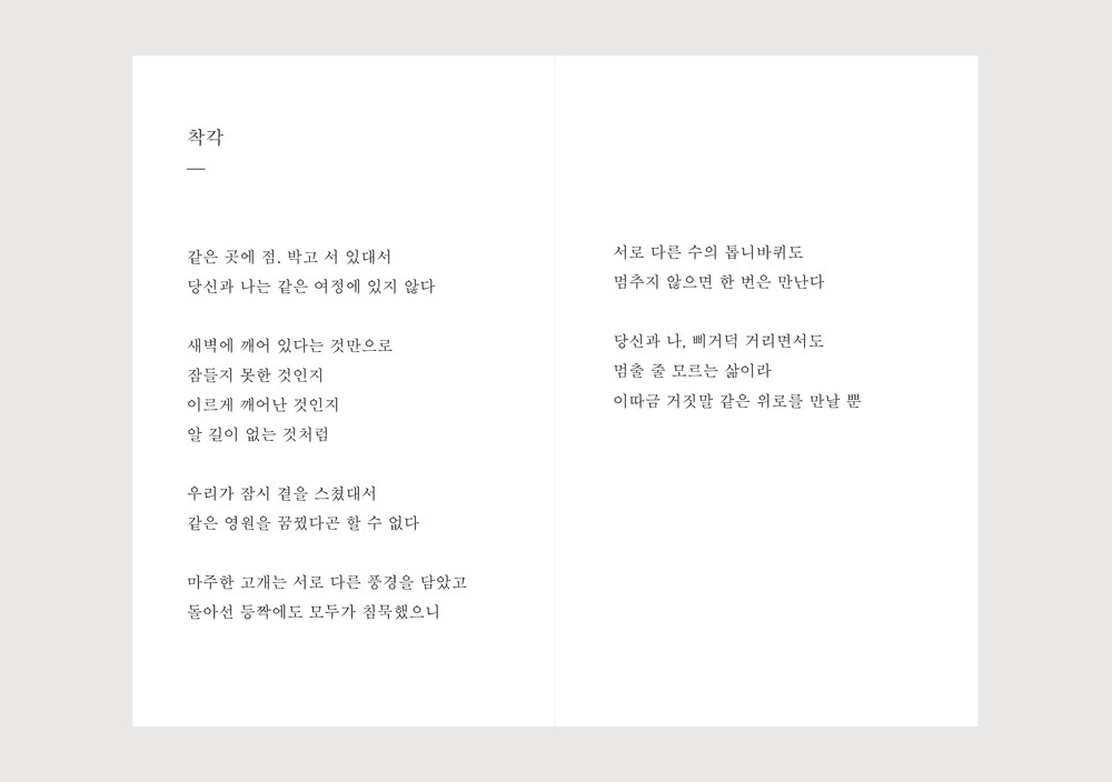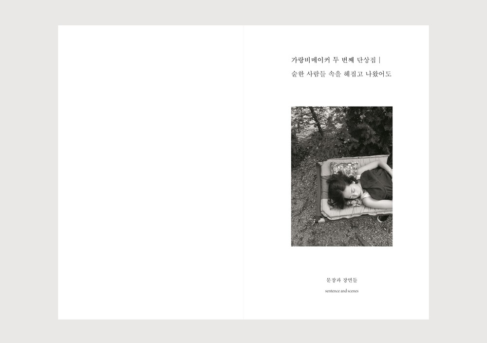가랑비메이커의 단상집 시리즈의 표지에는 각 권의 문장들을 관통하는 장면이 실립니다. 첫 번째 이야기 <지금, 여기를 놓친 채 그때, 거기를 말한 들>에 이어 3년 만에 출간된, 두 번째 이야기 <숱한 사람들 속을 헤집었어도>의 표지에는 복잡한 관계 속을 벗어났던 숲속 캠핑장에서의 낮잠이 실려 있습니다. 단상집을 수집하는 일은 문장과 더불어 장면들을 수집하는 일이 됩니다.