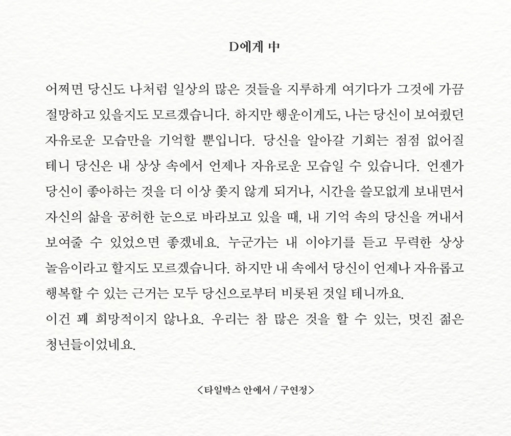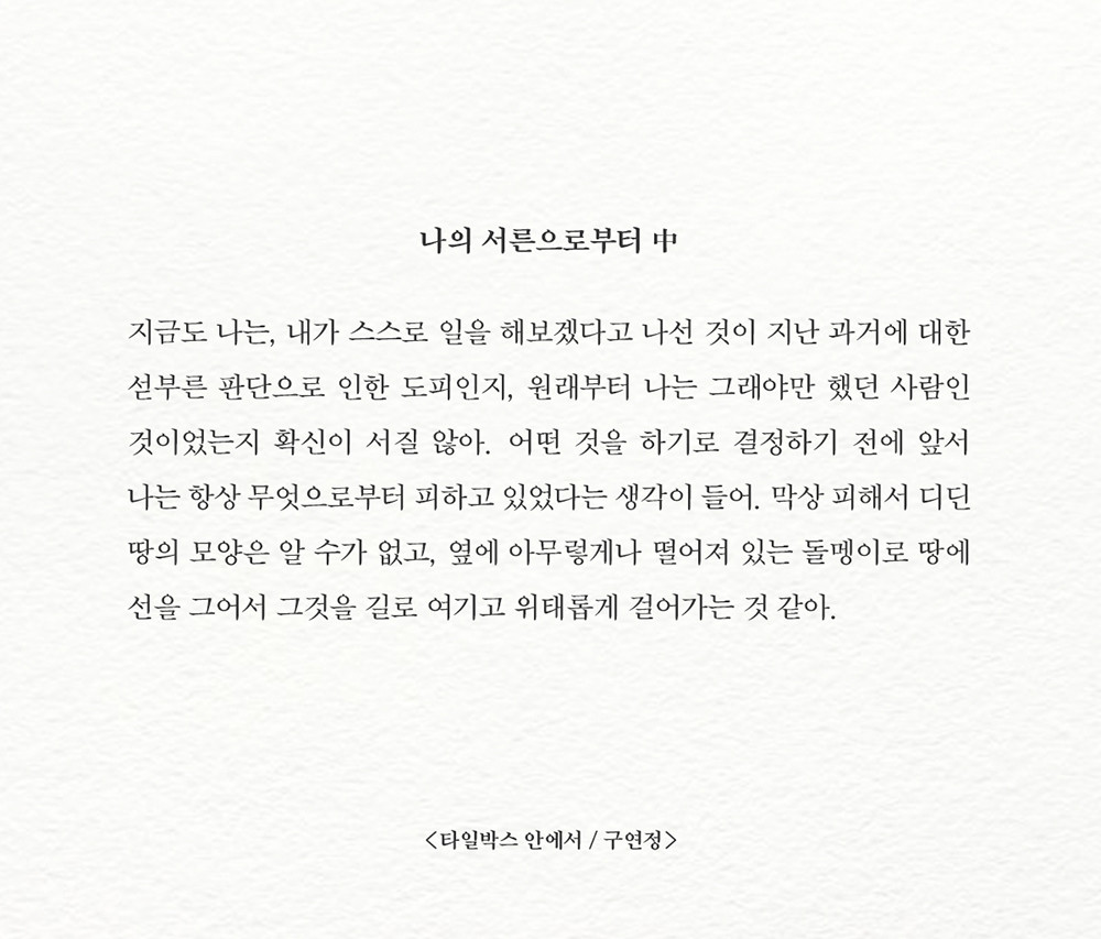 지금도 나는, 내가 스스로 일을 해보겠다고 나선 것이 지난 과거에 대한 섣부른 판단으로 인한 도피인지, 원래부터 나는 그래야만 했던 사람인 것이었는지 확신이 서질 않아. 어떤 것을 하기로 결정하기 전에 앞서 나는 항상 무엇으로부터 피하고 있었다는 생각이 들어. 막상 피해서 디딘 땅의 모양은 알 수가 없고, 옆에 아무렇게나 떨어져 있는 돌멩이로 땅에 선을 그어서 그것을 길로 여기고 위태롭게 걸어가는 것 같아.