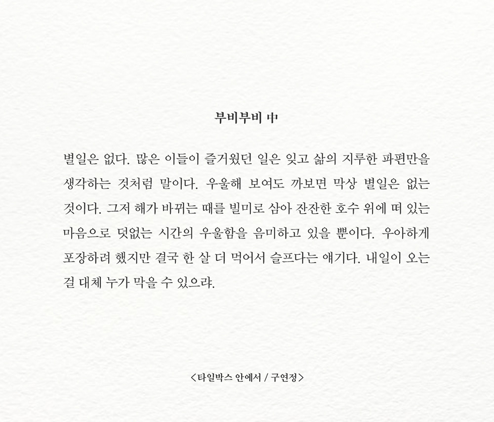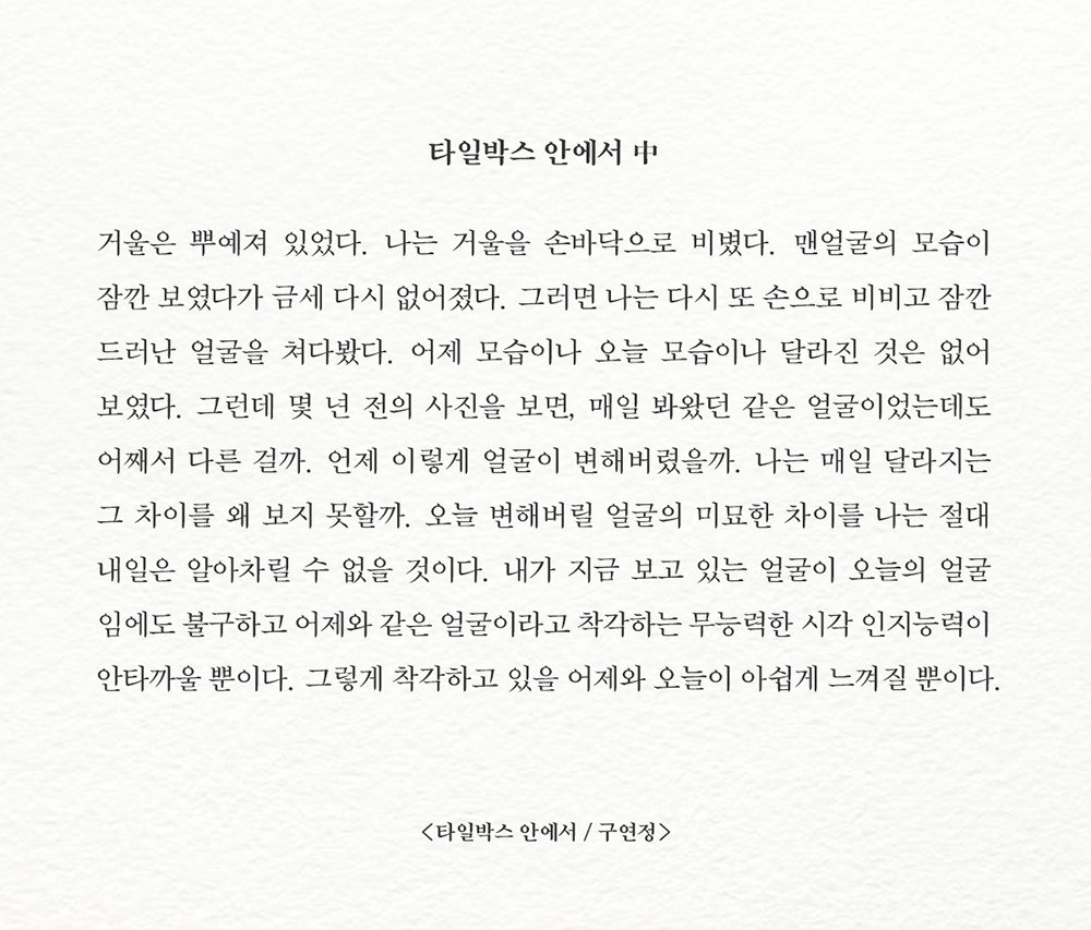 거울은 뿌예져 있었다. 나는 거울을 손바닥으로 비볐다. 맨얼굴의 모습이 잠깐 보였다가 금세 다시 없어졌다. 그러면 나는 다시 또 손으로 비비고 잠깐 드러난 얼굴을 쳐다봤다. 어제 모습이나 오늘 모습이나 달라진 것은 없어 보였다. 그런데 몇 년 전의 사진을 보면, 매일 봐왔던 같은 얼굴이었는데도 어째서 다른 걸까. 언제 이렇게 얼굴이 변해버렸을까. 나는 매일 달라지는 그 차이를 왜 보지 못할까. 오늘 변해버릴 얼굴의 미묘한 차이를 나는 절대 내일은 알아차릴 수 없을 것이다. 내가 지금 보고 있는 얼굴이 오늘의 얼굴임에도 불구하고 어제와 같은 얼굴이라고 착각하는 무능력한 시각 인지능력이 안타까울 뿐이다. 그렇게 착각하고 있을 어제와 오늘이 아쉽게 느껴질 뿐이다.