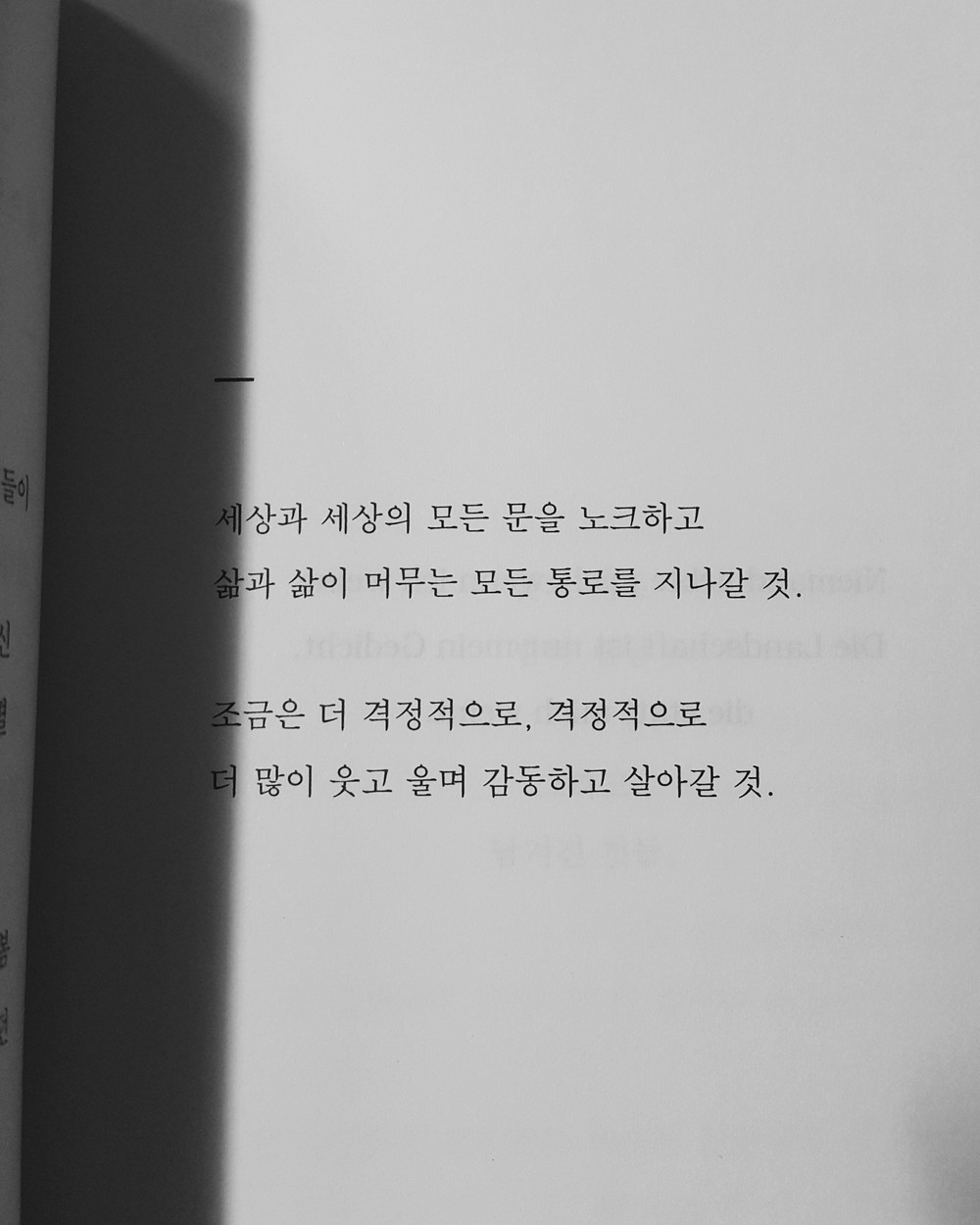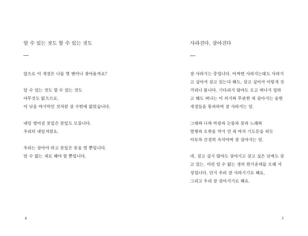네, 살고 싶지 않아도 살아지고 살고 싶은 날에도 살 고 있는, 이런 알 수 없는 생의 한가운데를 오래 서 성입니다. 단지 우리 잘 사라지기로 해요, 그리고 우리 잘 살아지기로 해요.