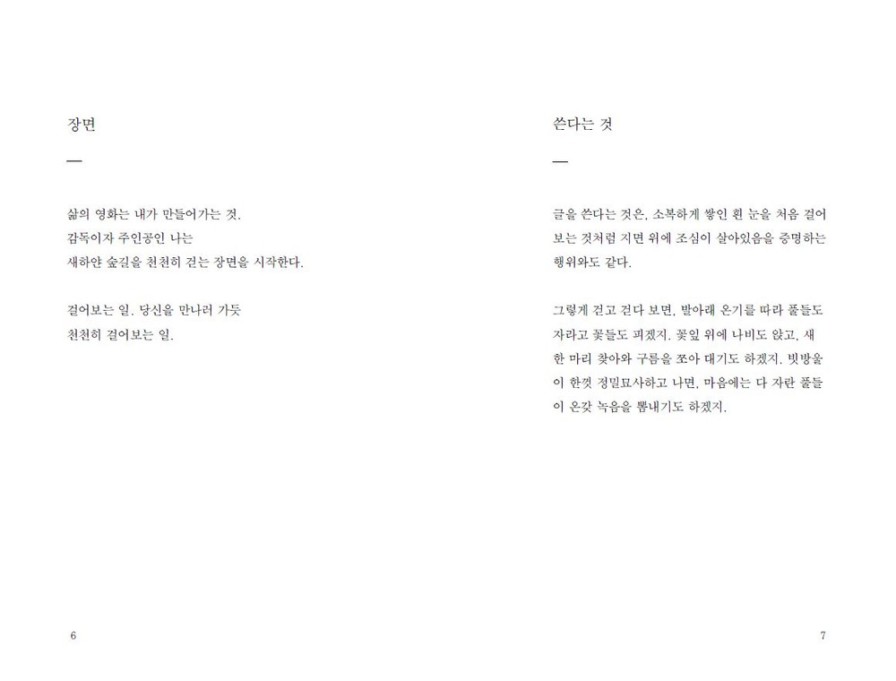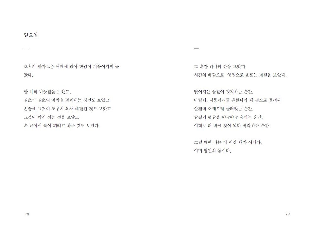 늘, 어떤 심란 속에서도 자연은 유일한 처방전과 같 았다. 지치는 날엔 사람이 아닌 이 불립문자의 풍경 속에서 더럽혀진 온몸을 닦았다. _96p