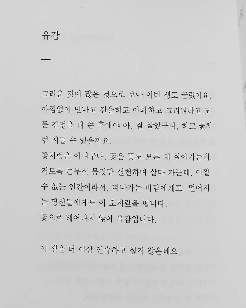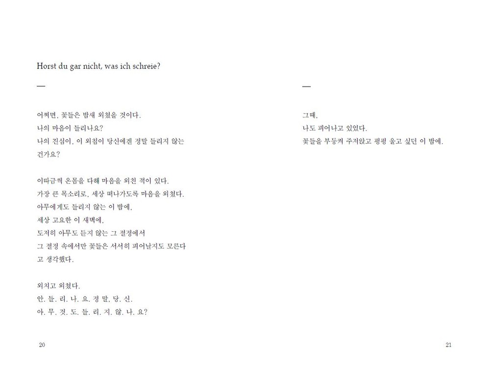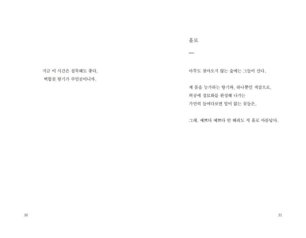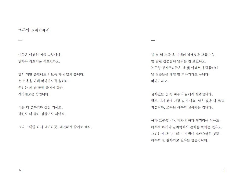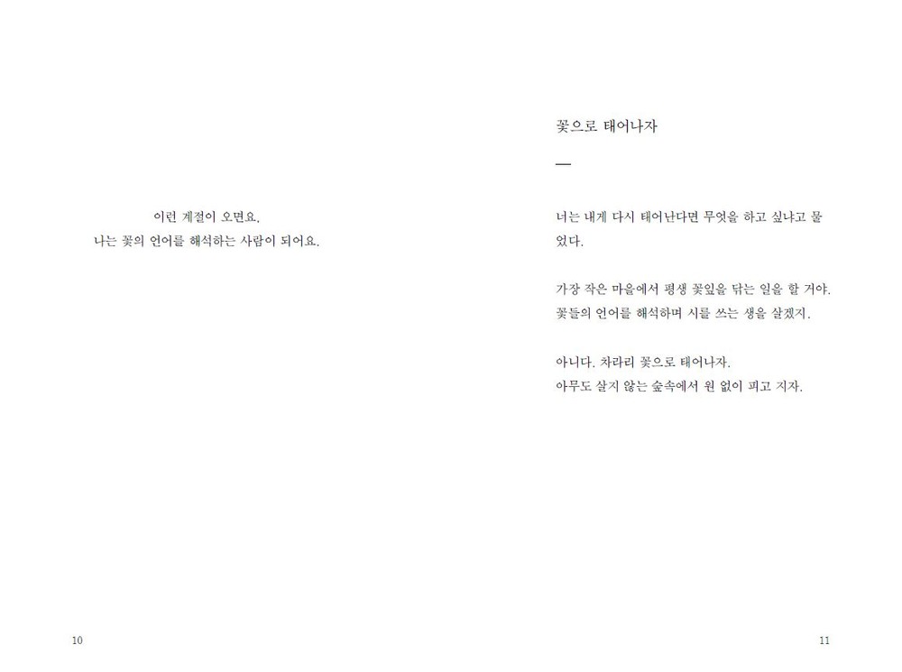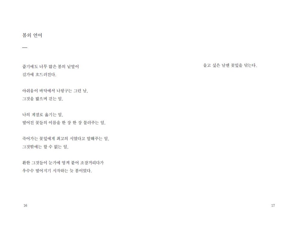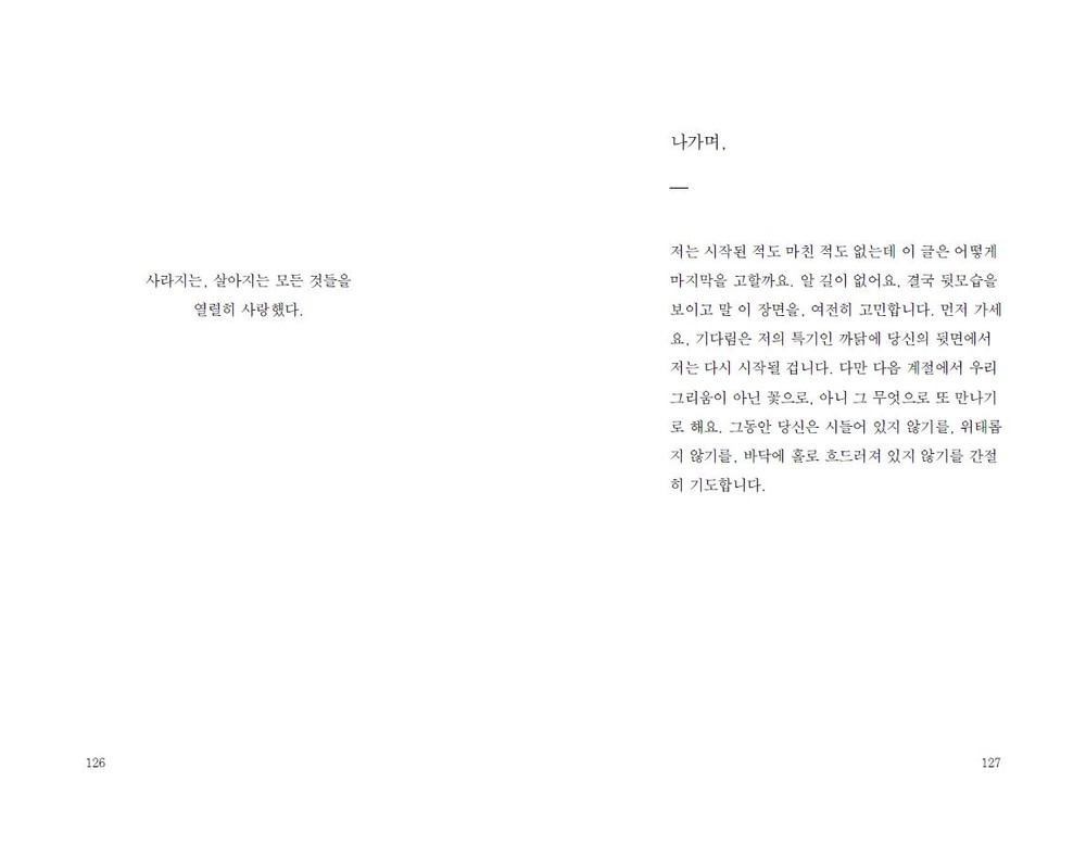 네, 여전히 저는 지는 꽃잎을 쓸어 담아 문장을 만들 어 봅니다. 기껏해야, 무릎을 꿇고 앉아서 시들어가 는 그들의 언어를 염탐하는 일 외에는 할 수 있는 것 이 없는 사람입니다. _89p
