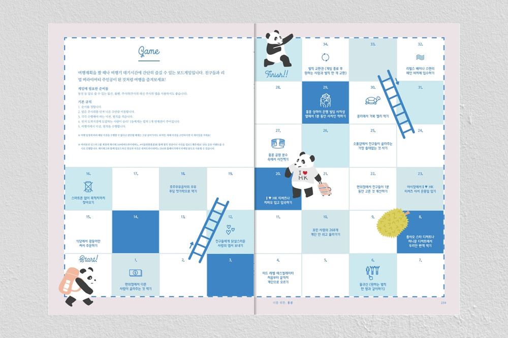 홍콩에서 꼭 가봐야 할 장소, 레스토랑 등에서 특별한 추억을 쌓을 수 있는 미션과 벌칙(우유 푸딩 젓가락으로 먹기, 홍콩 스타일 두리안 디저트 먹기 등등)이 가득한 보드게임을 담았습니다. 여행계획을 짜거나 비행기 대기시간에 간단히 즐길 수 있습니다.
