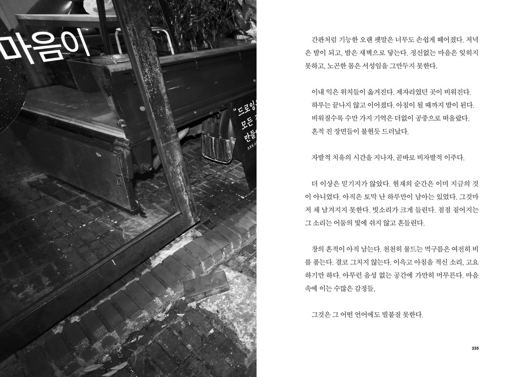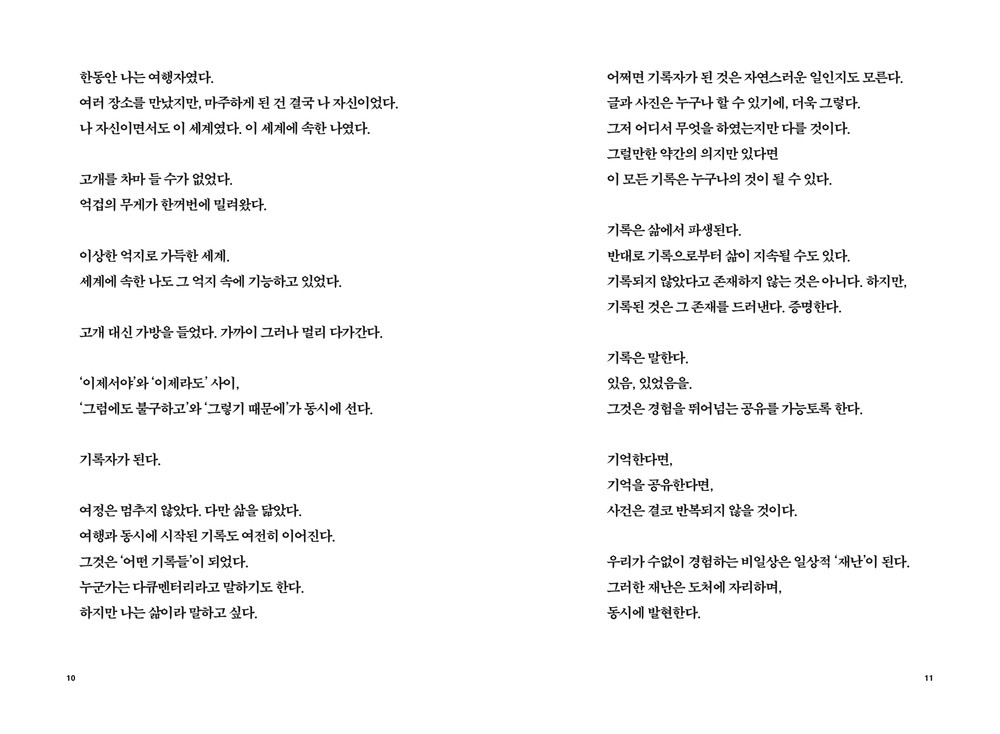 사전에서 기록은 ‘사실을 적음’이라 푼다. 하지만 기록자의 기록은 ‘삶을 적음’에 더욱 가깝다. ‘삶’은 ‘사실’과 비슷한 맥락에 있으면서도 완전히 다르다. ‘사실’은 경험을 배제하고서는 성립조차 되지 않기 때문이다. 기록은 반드시 경험의 범주 안에서 작동한다. 함께 과정을 겪으며 탄생하는 반사된 장면, 지속된 만남과 공감한 마음. 그래서 마음으로 읽고 쓰는 기록이 된다. 분석하는 태도를 취하지 않았다. 아니, 취할 수 없었다.