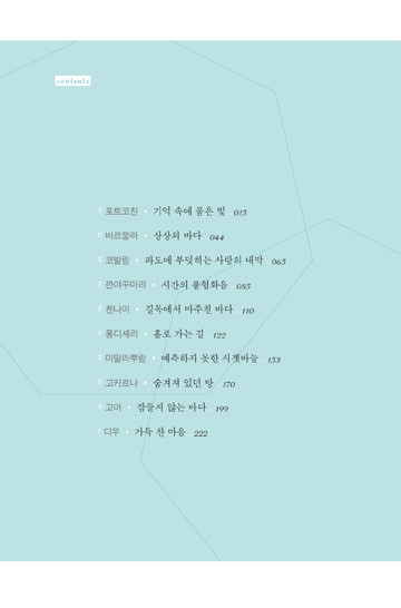1. 포트코친 - 기억 속에 품은 빛 2. 바르깔라 - 상상의 바다 3. 코발람 - 파도에 부딪히는 사랑의 내막 4. 깐야꾸마리 - 시간의 불협화음 5. 첸나이 - 길목에서 마주친 바다 6. 퐁디셰리 - 홀로 가는 길 7. 마말라뿌람 - 예측하지 못한 시곗바늘 8. 고카르나 - 숨겨져 있던 방 9. 고아 - 잠들지 않는 바다 10. 디우 - 가득 찬 마음