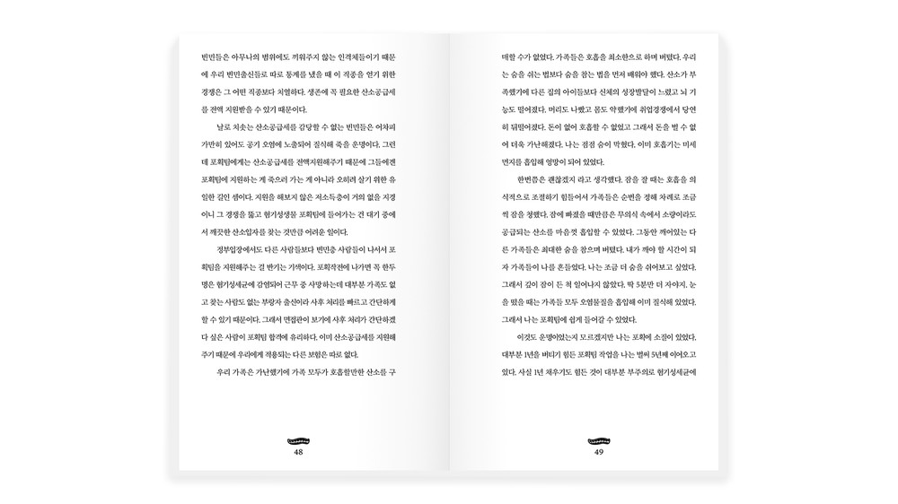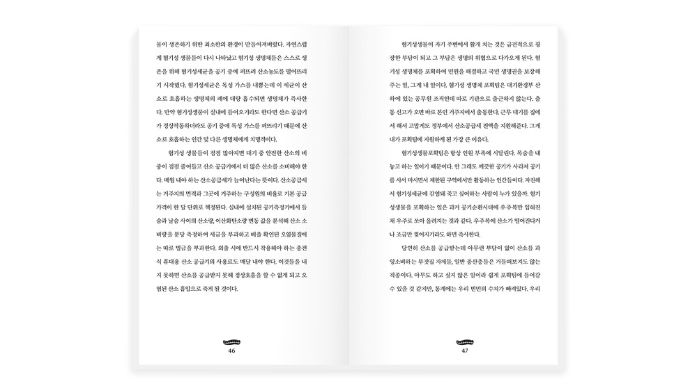"저놈부터 마스크를 벗겨라. 검은 이빨이 말했다. 놈들이 환호했다. 이제 보니 놈들 모두 이빨이 새까맸다. 신입은 발길질하며 강하게 저항했다. 신입도 호흡을 최대한 참고 있었는지 얼마 가지 못해 캑캑 댔고 남은 산소를 다 마셔버렸다. 산소를 다 썼나 보지. 걱정 말라고, 오염된 산소가 여기 충분하니 들이마셔 보라고. 네가 선택받은 자인지 확인해보겠다. 놈들이 신입의 마스크를 벗겼다. 신입은 눈을 질끈 감은 채 숨을 참았다. 놈들이 내 목에 칼을 들이대고 있어 도울 수 없었다. 칼이 문제가 아니라 이미 나 역시 호흡할 수 없어 돕는다 해도 둘 다 질식할 게 뻔했다. 남은 산소량 6%."
