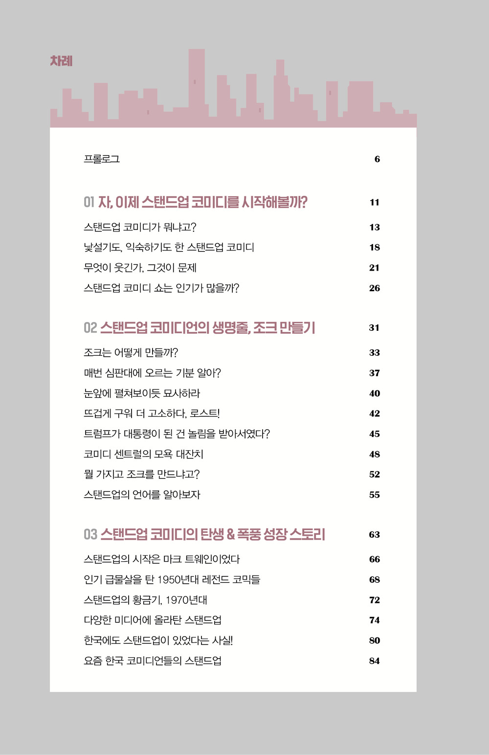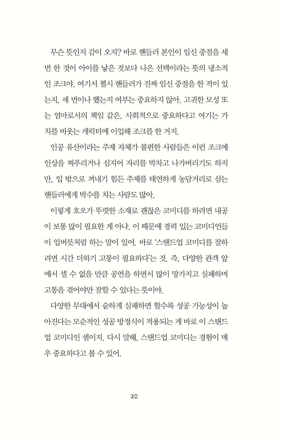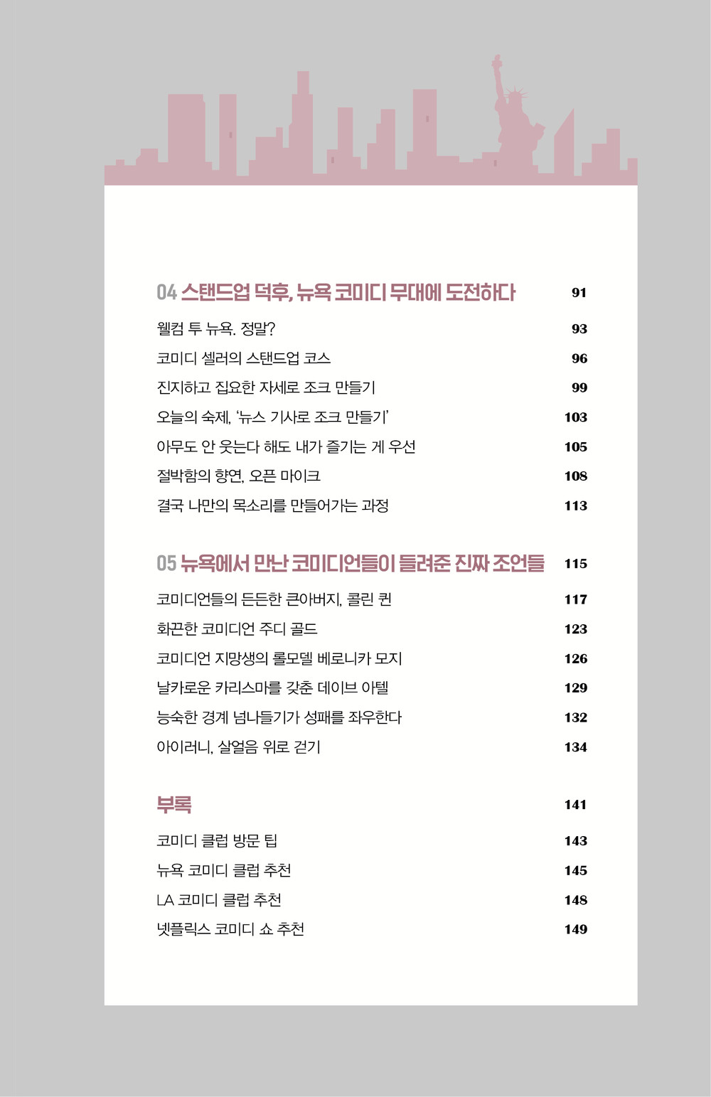 특히 부록에 있는 코미디 클럽 방문 팁과 뉴욕과 LA에서 가볼 만한 코미디 클럽 리스트는 스탠드업 코미디를 본토에서 직접 경험해보고자 하는 사람에게도 유용할 것이다.
