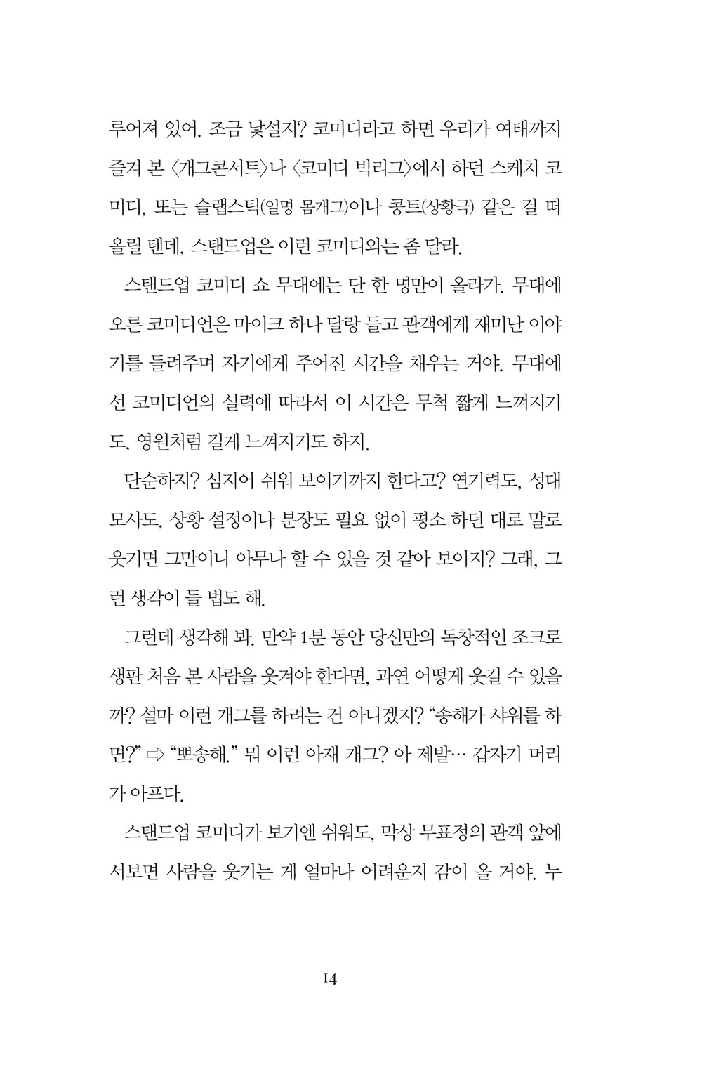 저자는 단 한 명의 코미디언이 나와서 오직 말로만 이끌어나가는 스탠드업 코미디를 이렇게 설명한다.