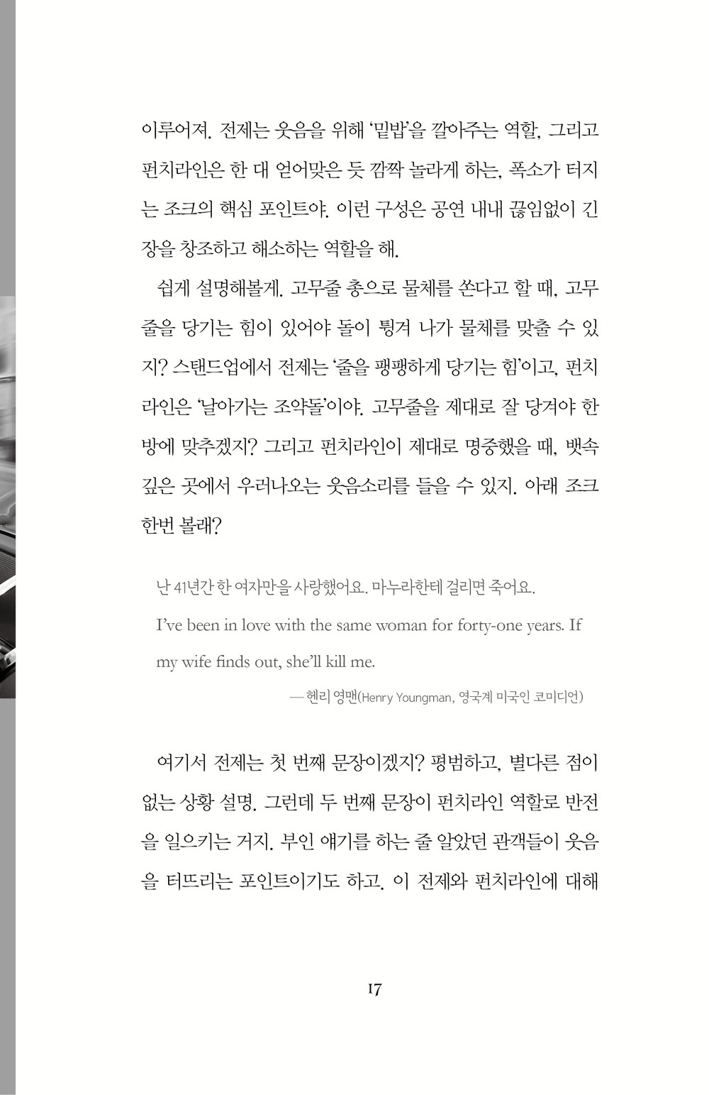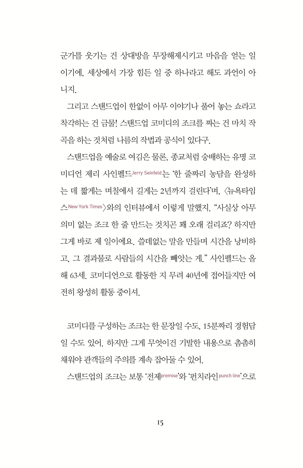 더불어, 이 책의 진정한 가치는 저자가 직접 뉴욕으로 날아가 두 달 동안 뉴욕 최고의 스탠드업 코미디 클럽에서 코미디 코스를 이수하고, 맨해튼 전역의 클럽 오픈 마이크 무대에 서고, 유명 코미디언들을 인터뷰한 내용을 담았다는 데에 있다.