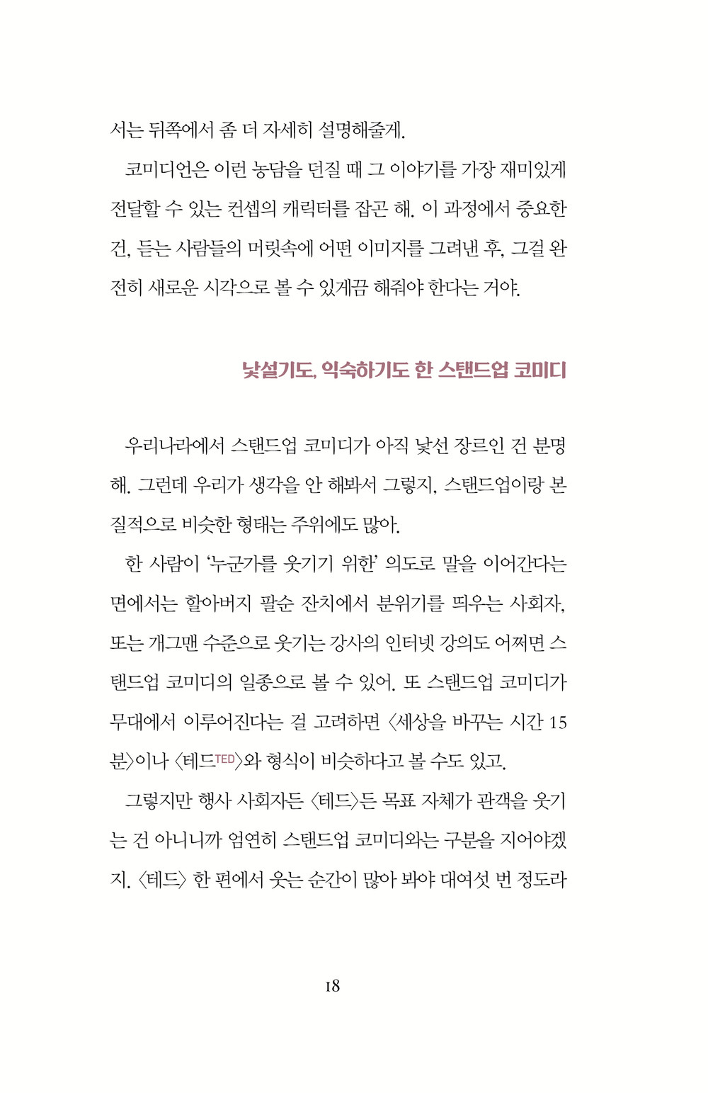 '테드' 한 편에서 웃는 순간이 많아 봐야 대여섯 번 정도라고 하면, 스탠드업 코미디는 관객이 쉴 새 없이 웃도록 만드는 게 목표야.