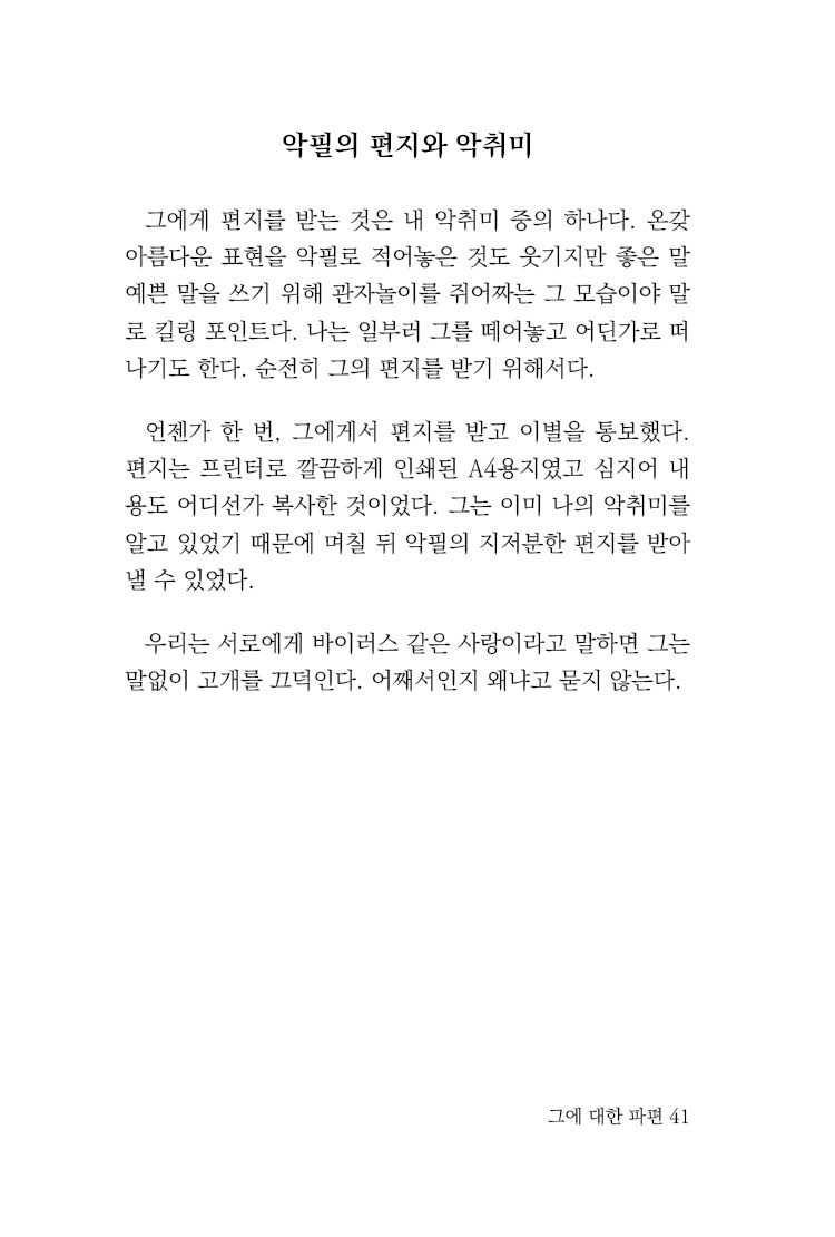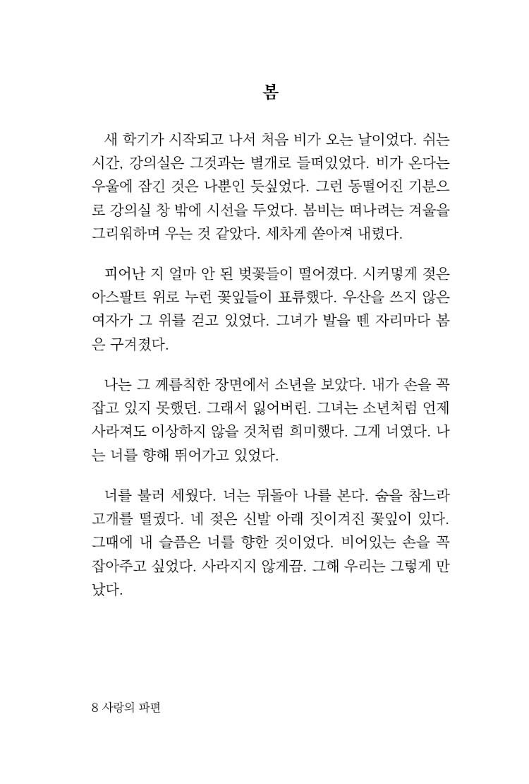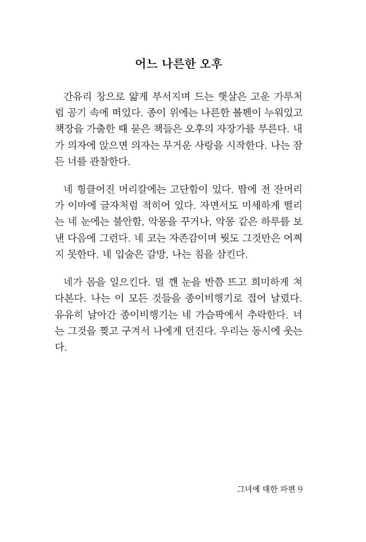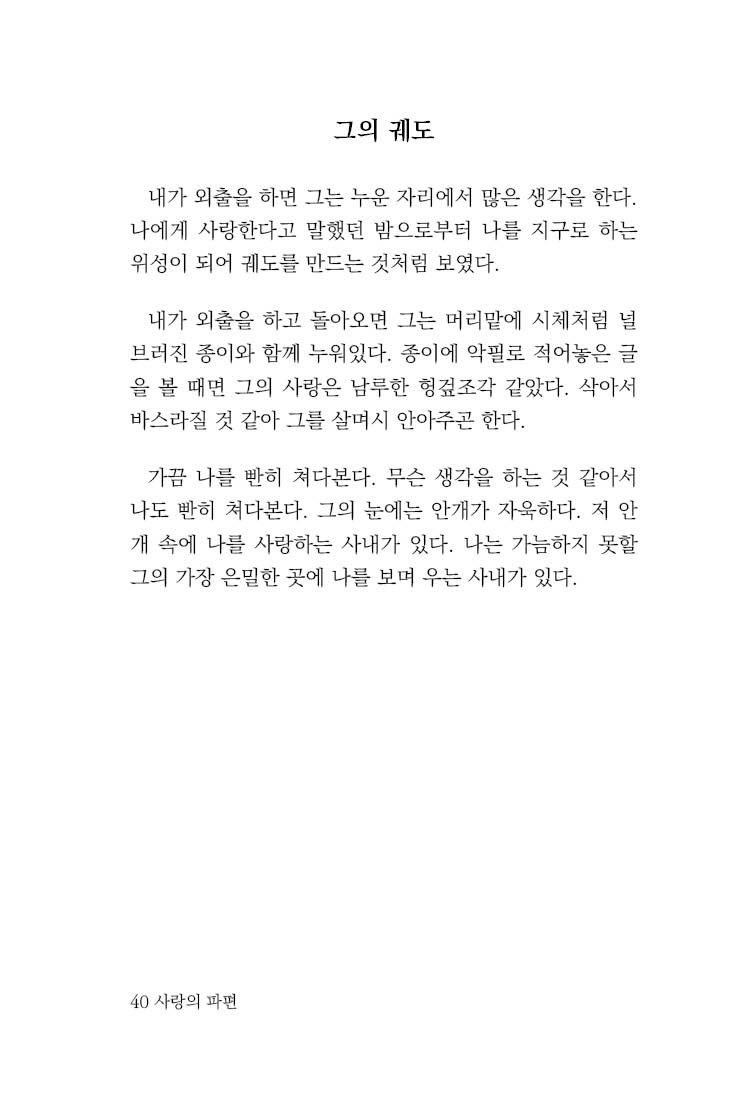 각자의 상처를 가진 남자와 여자가 만나서 헤어지기까지의 비연속적 순간들을 비망록(파편) 형식으로 적은 단상집, 또는 단편소설입니다. <그녀의 대한 파편 30편>, <그에 대한 파편 30편>으로 구성되어 있습니다. 작중 남녀의 보편적이지 않은 연애를 통해 '사랑'에 대한 고민, 사랑하는 이의 상처와 실체를 받아드리며 겪는 좌절과 극복의 단면을 담았습니다.