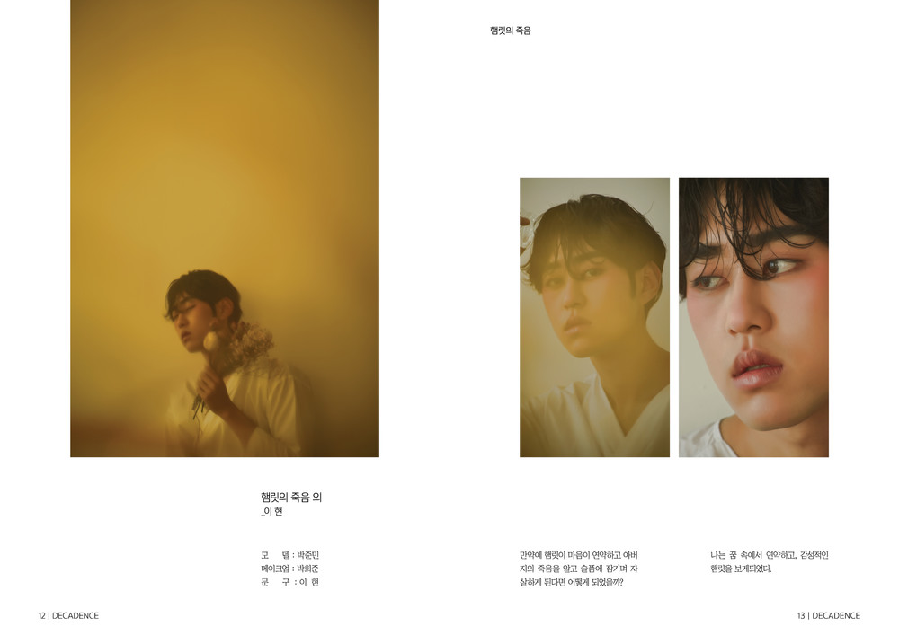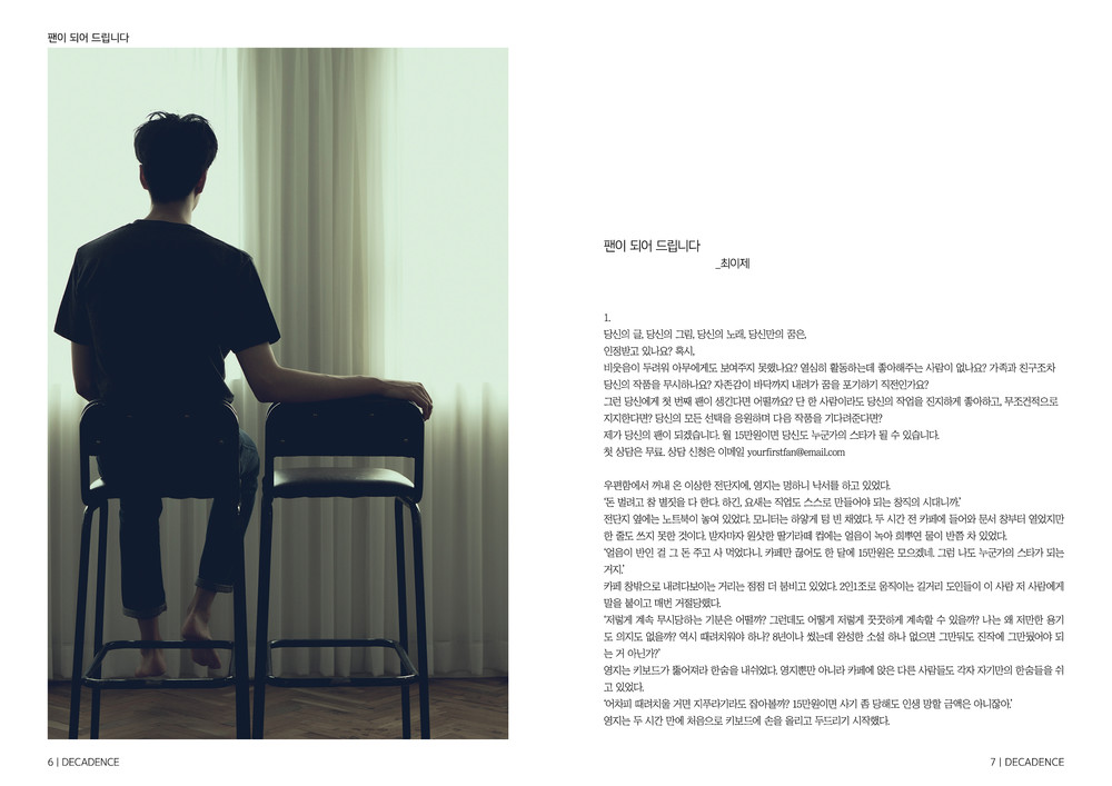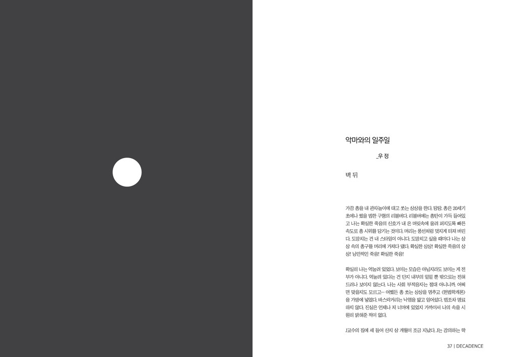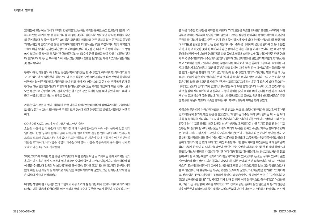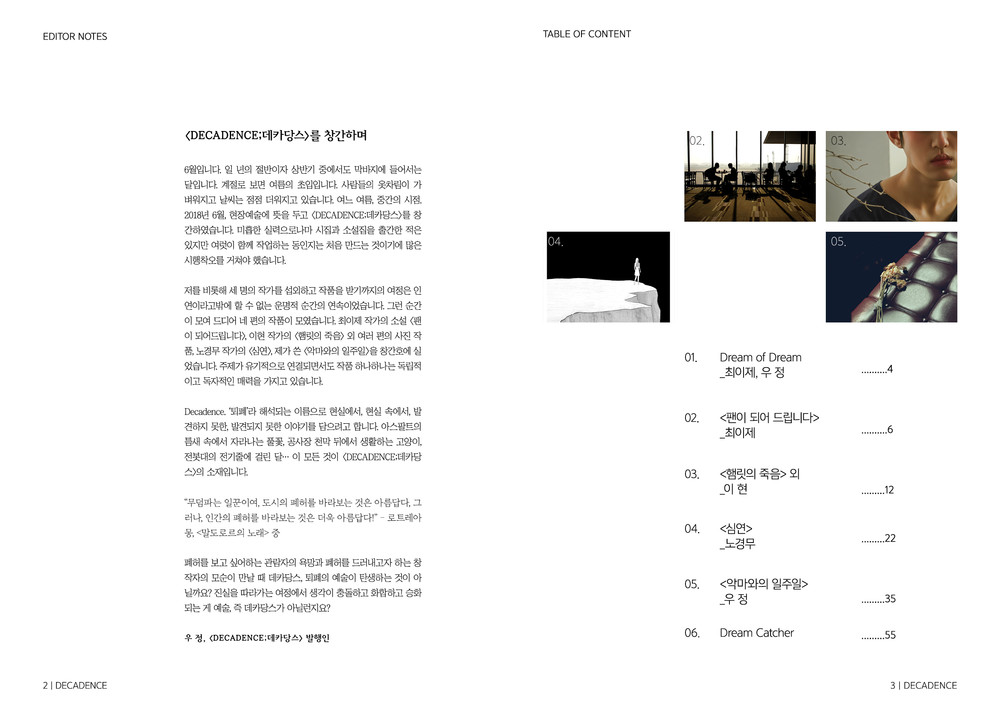 <Decadence;데카당스>에는 최이제 작가의 소설 <팬이 되어드립니다>, 이현 작가의 사진작품 <햄릿의 죽음> 외 여러 편, 노경무 작가의 그래픽 노블 <심연>, 우정 작가의 소설 <악마와의 일주일>을 창간호에 실었습니다. 주제가 유기적으로 연결되면서도 작품 하나하나는 독립적이고 독자적인 매력을 가지고 있습니다.