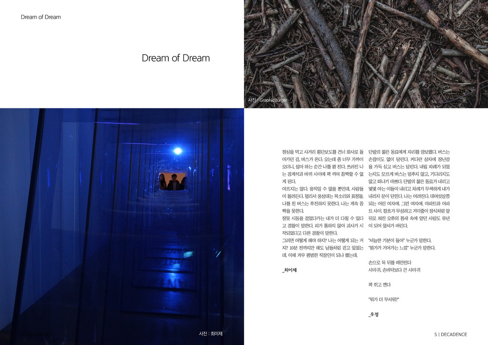 Decadence. ‘퇴폐’라 해석되는 이름으로 현실에서, 현실 속에서, 발견하지 못한, 발견되지 못한 이야기를 담으려고 합니다. 아스팔트의 틈새 속에서 자라나는 풀꽃, 공사장 천막 뒤에서 생활하는 고양이, 전봇대의 전기줄에 걸린 달… 이 모든 것이 <DECADENCE;데카당스>의 소재입니다.