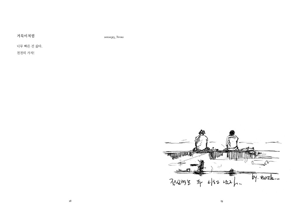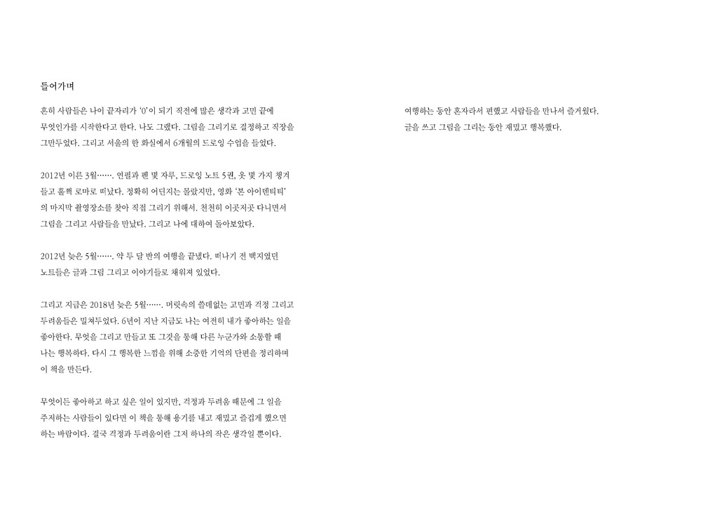 여행 후 그림 수업을 가르쳤던 선생님이 노트를 책으로 만들면 좋겠다고 얘기했습니다. 아마 그 때부터 무의식?적으로 노트를 책으로 만들고 싶어 했던 것 같습니다. 소중한 추억인 이 여행을 정리하고 글과 그림을 통해 좋아하는 것에 대한 걱정과 불안에 사로잡혀 있는 사람들에게 ‘그저 하는 것의 즐거움’이라는 메세지를 전하고 싶습니다. 결국 걱정과 두려움이란 하나의 작은 생각일 뿐이니까요.