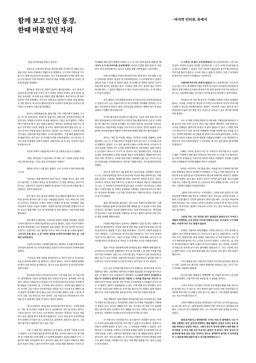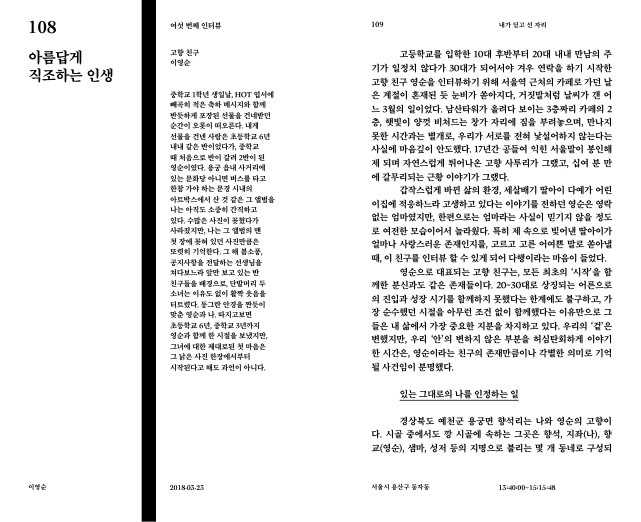 『내가 딛고 선 자리』에 수록된 6명의 인터뷰 글과(인터뷰에 성공하지 못해) 에세이로 남은 2명의 인물에 대한 글은, 그 만남의 성패 자체보다 우리가 품어온 생각이 크게 다르지 않음을, 불안한 시대 속 우리가 절망이 아닌 희망이라는 이름이 될 수 있음을, 이럴 수도 저럴 수도 없는 ‘고임’의 상태에서 허우적대더라도 결국 내일을 향해 과감히 ‘한발’을 내 딛을 수 있다는 용기를 선사해준다.