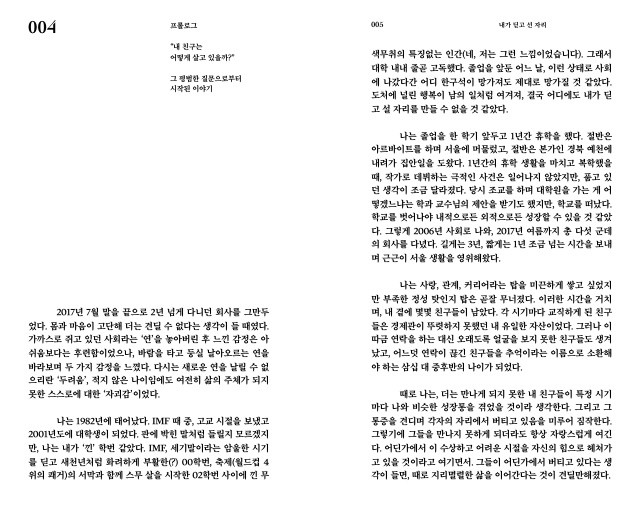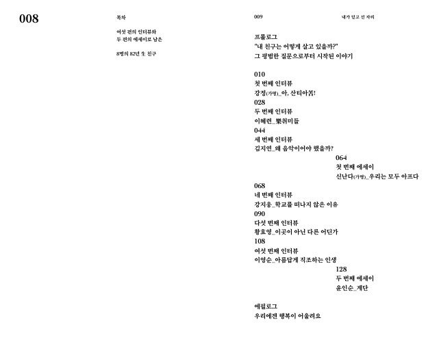 저자의 고향 친구, 대학 친구, 사회 친구인 이들은 미혼, 기혼, 자녀를 가진 기혼자이자 정규직 직장인, 예술가, 시간강사이자 프리랜서 문화기획자, 디자이너, 개인사업자로서 제 한 몸 뉘일 간절한 자리를 만들어가기 위해 각자의 영역에서 고군분투하고 있는 사람들이다.